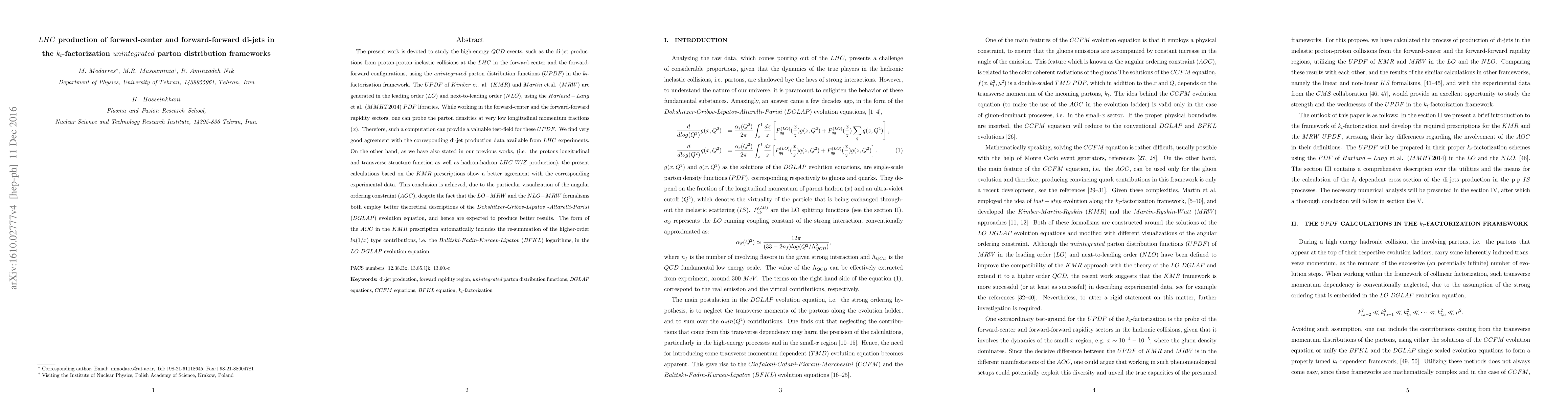 The present work is devoted to study the high-energy $QCD$ events, such as the di-jet productions from proton-proton inelastic collisions at the $LHC$ in the forward-center and the forward-forward configurations, using the $unintegrated$ parton distribution functions ($UPDF$) in the $k_t$-factorization framework. The $UPDF$ of $Kimber$ et. al. ($KMR$) and $Martin$ et.al. ($MRW$) are generated in the leading order ($LO$) and next-to-leading order ($NLO$), using the $Harland-Lang$ et al. ($MMHT2014$) $PDF$ libraries. While working in the forward-center and the forward-forward rapidity sectors, one can probe the parton densities at very low longitudinal momentum fractions ($x$). Therefore, such a computation can provide a valuable test-field for these $UPDF$. We find very good agreement with the corresponding di-jet production data available from $LHC$ experiments. On the other hand, as we have also stated in our previous works, (i.e. the protons longitudinal and transverse structure function as well as hadron-hadron $LHC$ $W/Z$ production), the present calculations based on the $KMR$ prescriptions show a better agreement with the corresponding experimental data. This conclusion is achieved, due to the particular visualization of the angular ordering constraint ($AOC$), despite the fact that the $LO-MRW$ and the $NLO-MRW$ formalisms both employ better theoretical descriptions of the $Dokshitzer$-$Gribov$-$Lipatov$ -$Altarelli$-$Parisi$ ($DGLAP$) evolution equation, and hence are expected to produce better results. The form of the $AOC$ in the $KMR$ prescription automatically includes the re-summation of the higher-order $ln({1/x})$ type contributions, i.e. the $Balitski$-$Fadin$-$Kuraev$-$Lipatov$ ($BFKL$) logarithms, in the $LO$-$DGLAP$ evolution equation.