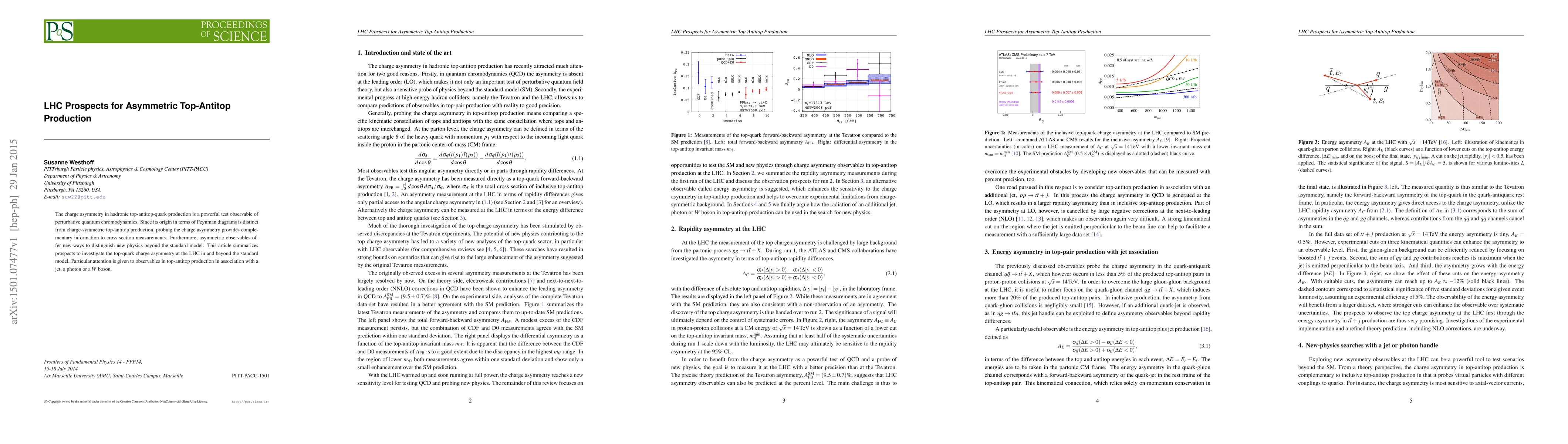 The charge asymmetry in hadronic top-antitop-quark production is a powerful test observable of perturbative quantum chromodynamics. Since its origin in terms of Feynman diagrams is distinct from charge-symmetric top-antitop production, probing the charge asymmetry provides complementary information to cross section measurements. Furthermore, asymmetric observables offer new ways to distinguish new physics beyond the standard model. This article summarizes prospects to investigate the top-quark charge asymmetry at the LHC in and beyond the standard model. Particular attention is given to observables in top-antitop production in association with a jet, a photon or a W boson.