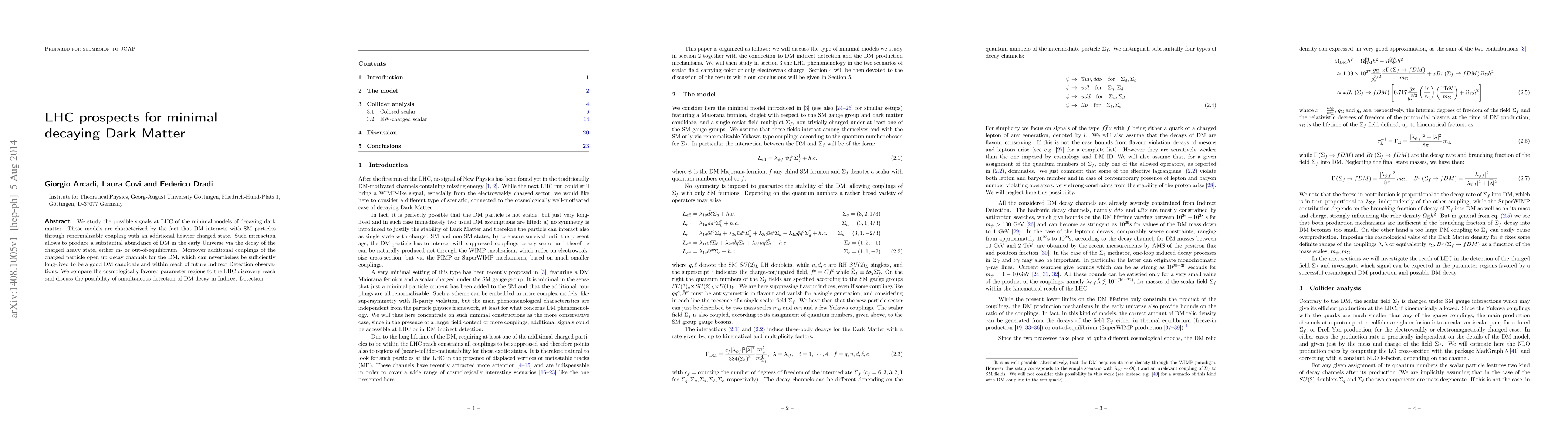 We study the possible signals at LHC of the minimal models of decaying dark matter. Those models are characterized by the fact that DM interacts with SM particles through renormalizable coupling with an additional heavier charged state. Such interaction allows to produce a substantial abundance of DM in the early Universe via the decay of the charged heavy state, either in- or out-of-equilibrium. Moreover additional couplings of the charged particle open up decay channels for the DM, which can nevertheless be sufficiently long-lived to be a good DM candidate and within reach of future Indirect Detection observations. We compare the cosmologically favored parameter regions to the LHC discovery reach and discuss the possibility of simultaneous detection of DM decay in Indirect Detection.