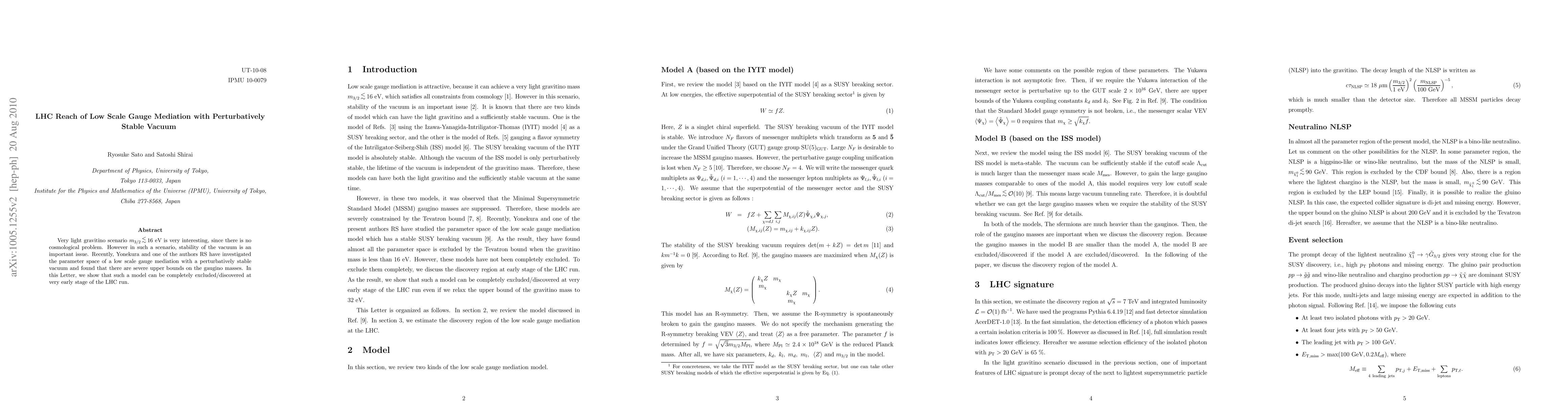 Very light gravitino scenario m_{3/2} < 16 eV is very interesting, since there is no cosmological problem. However in such a scenario, stability of the vacuum is an important issue. Recently, Yonekura and one of the authors RS have investigated the parameter space of a low scale gauge mediation with a perturbatively stable vacuum and found that there are severe upper bound on the gaugino masses. In this paper, we show that such a model can be completely excluded/discovered at very early stage of the LHC run.