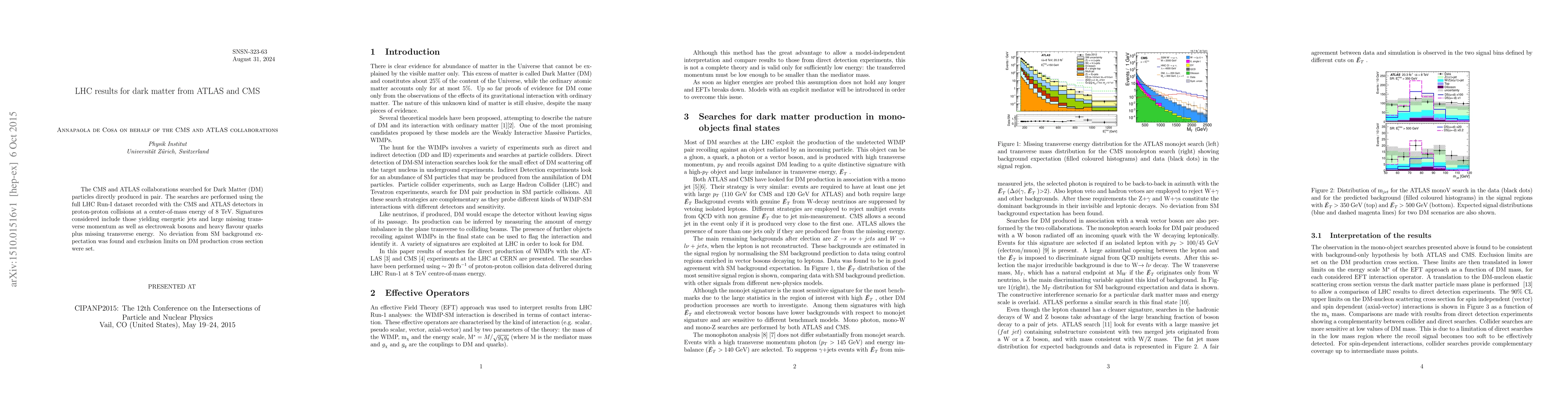 The CMS and ATLAS collaborations analyzed the full LHC Run-I dataset for direct evidence of Dark Matter particles, but found no deviations from Standard Model expectations, setting new exclusion limits on Dark Matter production cross sections.