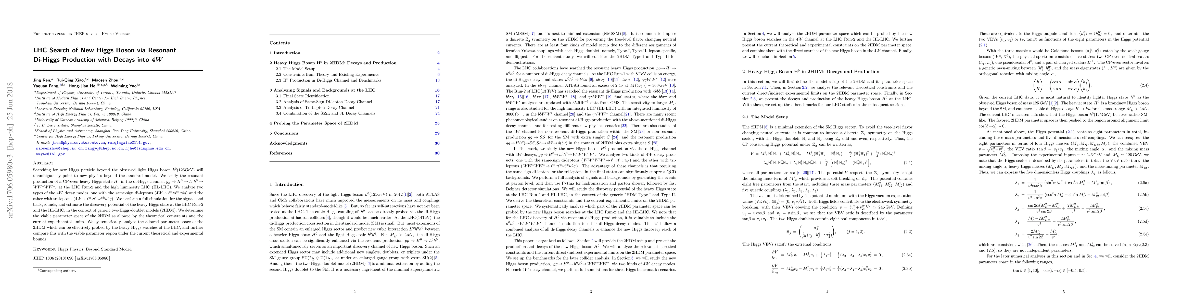 Searching for new Higgs particle beyond the observed light Higgs boson h(125GeV) will unambiguously point to new physics beyond the standard model. We study the resonant production of a CP-even heavy Higgs state $H^0$ in the di-Higgs channel via, $gg\to H^0\to h^0h^0\to WW^*WW^*$, at the LHC Run-2 and the high luminosity LHC (HL-LHC). We analyze two types of the $4W$ decay modes, one with the same-sign di-leptons ($4W\to\ell^\pm\nu\ell^\pm\nu 4q$) and the other with tri-leptons ($4W\to\ell^\pm\nu\ell^\mp\nu\ell^\pm\nu 2q$). We perform a full simulation for the signals and backgrounds, and estimate the discovery potential of the heavy Higgs state at the LHC Run-2 and the HL-LHC, in the context of generical two-Higgs-doublet models (2HDM). We determine the viable parameter space of the 2HDM as allowed by the theoretical constraints and the current experimental limits. We systematically analyze the allowed parameter space of the 2HDM which can be effectively probed by the heavy Higgs searches of the LHC, and further compare this with the viable parameter region under the current theoretical and experimental bounds.