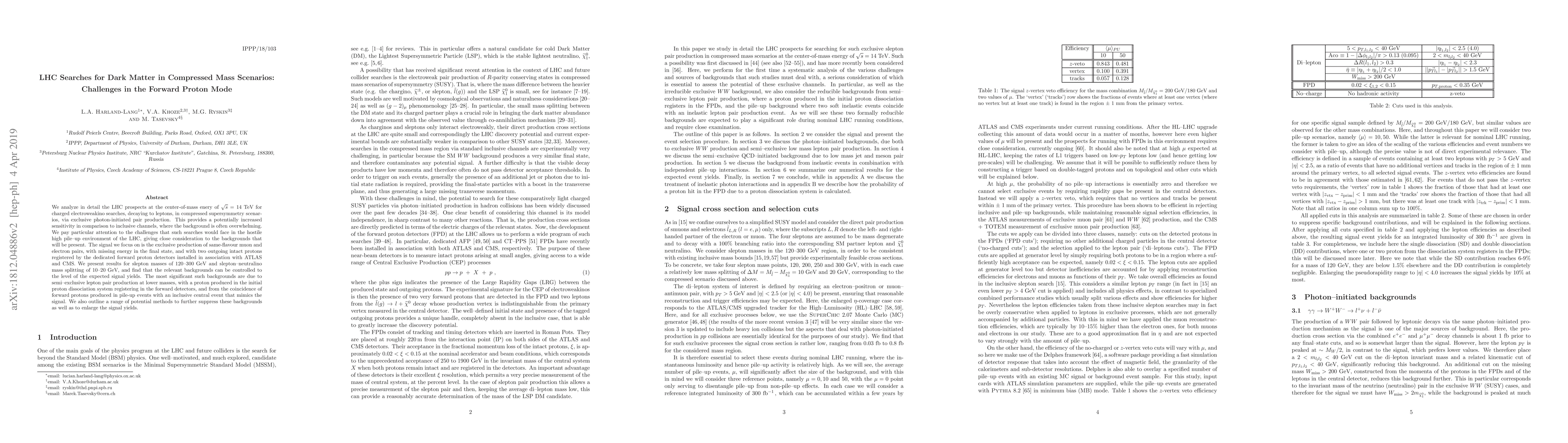 This paper examines the Large Hadron Collider's (LHC) potential for detecting dark matter in compressed supersymmetry scenarios via exclusive photon-initiated pair production, focusing on the forward proton mode. It highlights the challenges posed by high pile-up environments and identifies significant background sources, proposing methods to enhance signal detection.