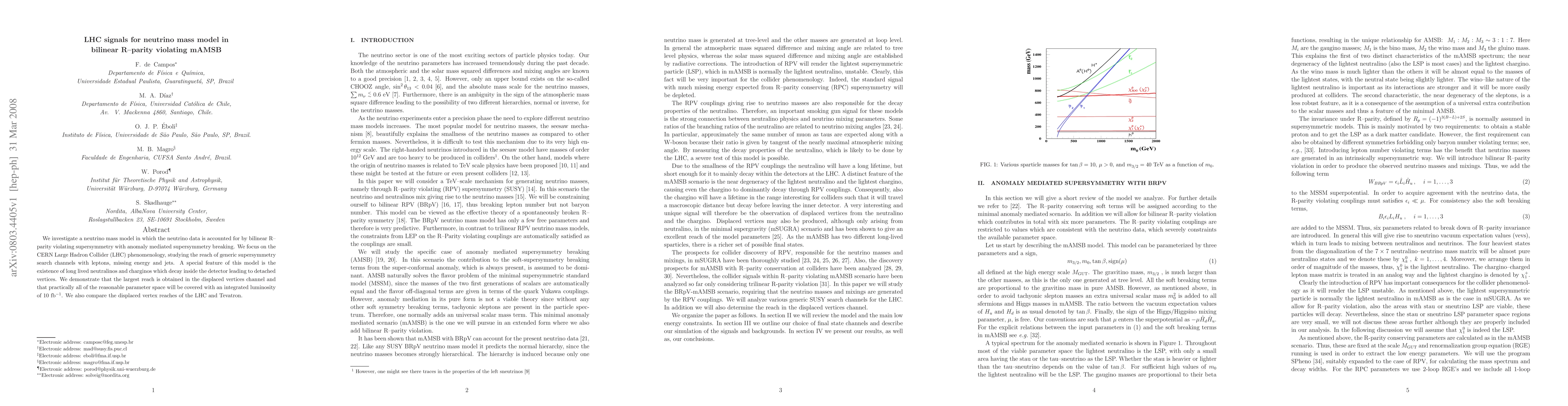 We investigate a neutrino mass model in which the neutrino data is accounted for by bilinear R-parity violating supersymmetry with anomaly mediated supersymmetry breaking. We focus on the CERN Large Hadron Collider (LHC) phenomenology, studying the reach of generic supersymmetry search channels with leptons, missing energy and jets. A special feature of this model is the existence of long lived neutralinos and charginos which decay inside the detector leading to detached vertices. We demonstrate that the largest reach is obtained in the displaced vertices channel and that practically all of the reasonable parameter space will be covered with an integrated luminosity of 10 fb-1. We also compare the displaced vertex reaches of the LHC and Tevatron.