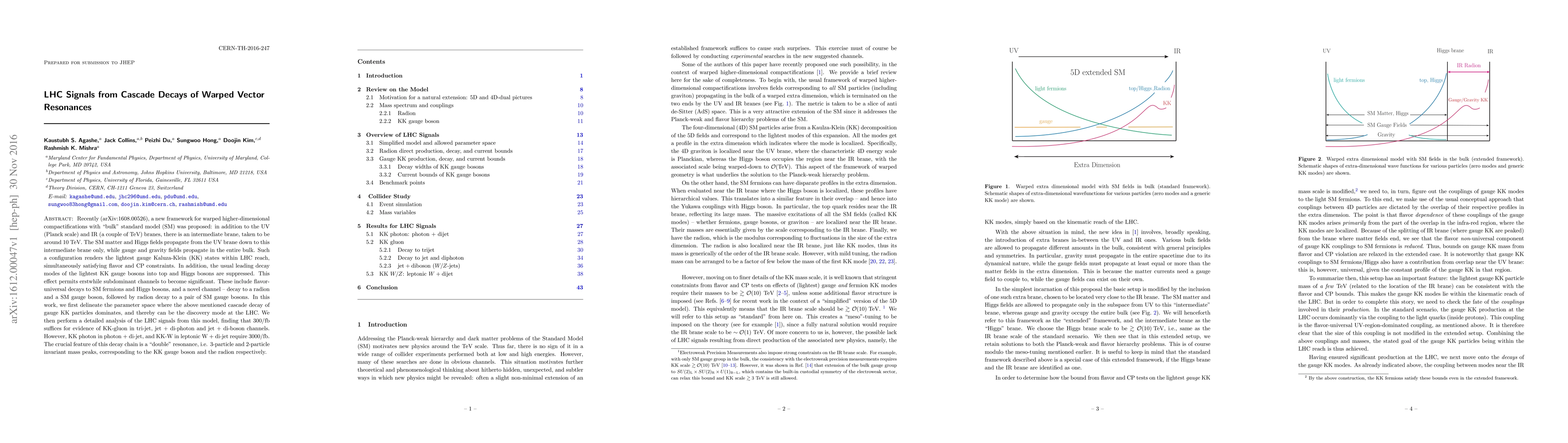 Recently (arXiv:1608.00526), a new framework for warped higher-dimensional compactifications with "bulk" standard model (SM) was proposed: in addition to the UV (Planck scale) and IR (a couple of TeV) branes, there is an intermediate brane, taken to be around 10 TeV. The SM matter and Higgs fields propagate from the UV brane down to this intermediate brane only, while gauge and gravity fields propagate in the entire bulk. Such a configuration renders the lightest gauge Kaluza-Klein (KK) states within LHC reach, simultaneously satisfying flavor and CP constraints. In addition, the usual leading decay modes of the lightest KK gauge bosons into top and Higgs bosons are suppressed. This effect permits erstwhile subdominant channels to become significant. These include flavor-universal decays to SM fermions and Higgs bosons, and a novel channel - decay to a radion and a SM gauge boson, followed by radion decay to a pair of SM gauge bosons. In this work, we first delineate the parameter space where the above mentioned cascade decay of gauge KK particles dominates, and thereby can be the discovery mode at the LHC. We then perform a detailed analysis of the LHC signals from this model, finding that 300/fb suffices for evidence of KK-gluon in tri-jet, jet + di-photon and jet + di-boson channels. However, KK photon in photon + di-jet, and KK-W in leptonic W + di-jet require 3000/fb. The crucial feature of this decay chain is a "double" resonance, i.e. 3-particle and 2-particle invariant mass peaks, corresponding to the KK gauge boson and the radion respectively.