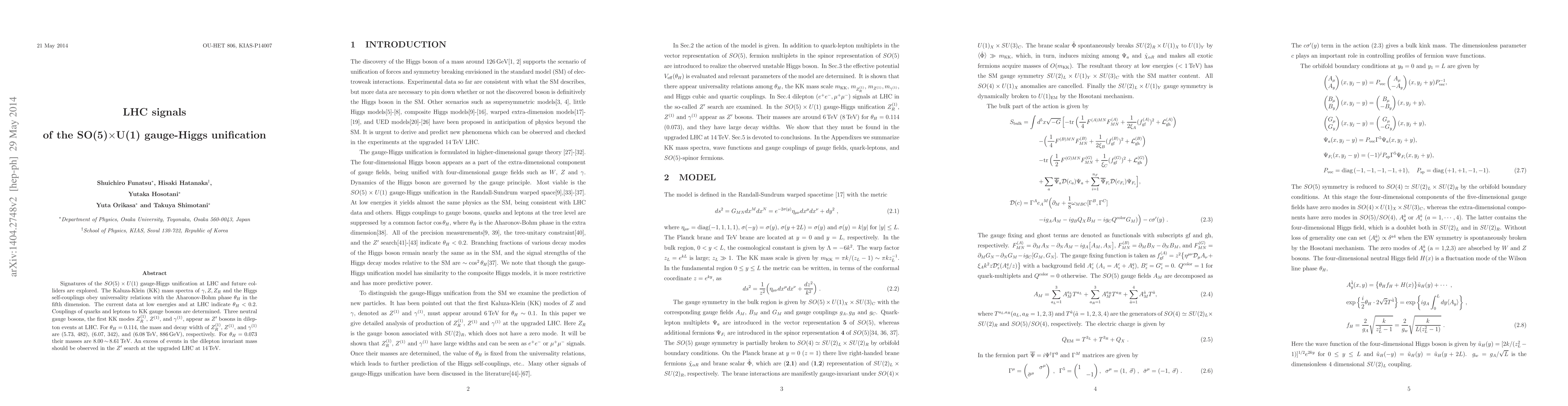 Signatures of the $SO(5)\times U(1)$ gauge-Higgs unification at LHC and future colliders are explored. The Kaluza-Klein (KK) mass spectra of $\gamma, Z, Z_R$ and the Higgs self-couplings obey universality relations with the Aharonov-Bohm (AB) phase $\theta_H$ in the fifth dimension. The current data at low energies and at LHC indicate $\theta_H <0.2$. Couplings of quarks and leptons to KK gauge bosons are determined. Three neutral gauge bosons, the first KK modes $Z_R^{(1)}$, $Z^{(1)}$, and $\gamma^{(1)}$, appear as $Z'$ bosons in dilepton events at LHC. For $\theta_H = 0.114$, the mass and decay width of $Z_R^{(1)}$, $Z^{(1)}$, and $\gamma^{(1)}$ are (5.73TeV, 482GeV), (6.07TeV, 342GeV), and (6.08TeV, 886GeV), respectively. For $\theta_H = 0.073$ their masses are 8.00TeV$\sim$8.61TeV. An excess of events in the dilepton invariant mass should be observed in the $Z'$ search at the upgraded LHC at 14TeV.