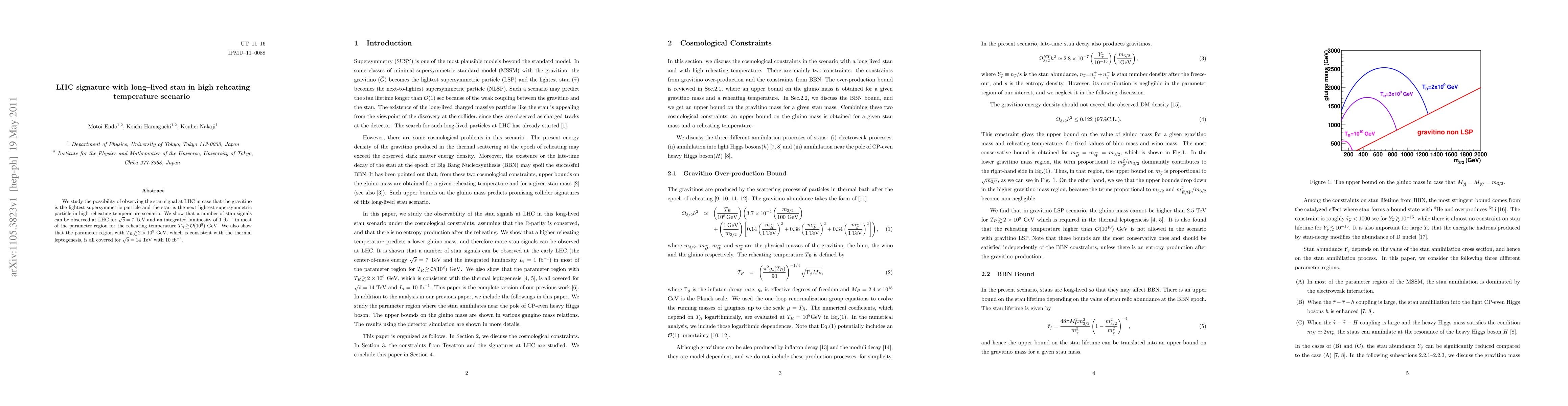 We study the possibility of observing the stau signal at LHC in case that the gravitino is the lightest supersymmetric particle and the stau is the next lightest supersymmetric particle in high reheating temperature scenario. We show that a number of stau signals can be observed at LHC for $\sqrt{s}=7 {\rm TeV}$ and an integrated luminosity of $1 {\rm fb}^{-1}$ in most of the parameter region for the reheating temperature $T_R\gsim{\cal O}(10^8) {\rm GeV}$. We also show that the parameter region with $T_R\gsim2\times10^9 {\rm GeV}$, which is consistent with the thermal leptogenesis, is all covered for $\sqrt{s}=14 {\rm TeV}$ with $10 {\rm fb}^{-1}$.