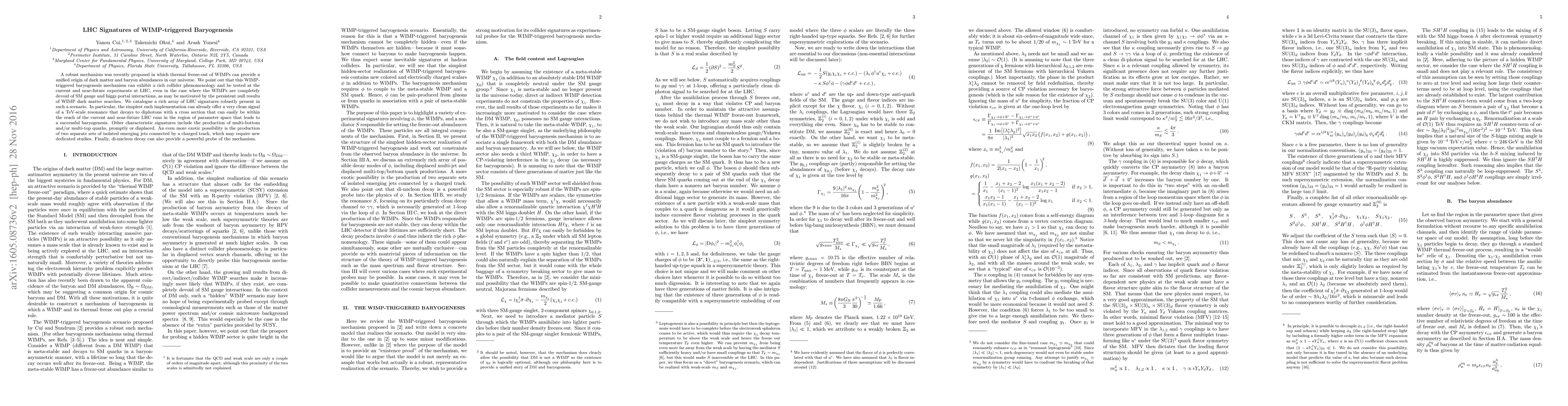 A robust mechanism was recently proposed in which thermal freeze-out of WIMPs can provide a unified origin of dark matter and baryon abundances in our universe. We point out that this WIMP-triggered baryogenesis mechanism can exhibit a rich collider phenomenology and be tested at the current and near-future experiments at LHC, even in the case where the WIMPs are completely devoid of SM gauge and higgs portal interactions, as may be motivated by the persistent null results of WIMP dark matter searches. We catalogue a rich array of LHC signatures robustly present in such a scenario. In particular, the simplest such implementation can already offer a very clean signal of a TeV-scale resonance that decays to diphotons with a cross section that can easily be within the reach of the current and near-future LHC runs in the region of parameter space that leads to a successful baryogenesis. Other characteristic signatures include the production of multi-bottom and/or multi-top quarks, promptly or displaced. An even more exotic possibility is the production of two separate sets of isolated emerging jets connected by a charged track, which may require new dedicated studies. Finally, di-nucleon decay can also provide a powerful probe of the mechanism.