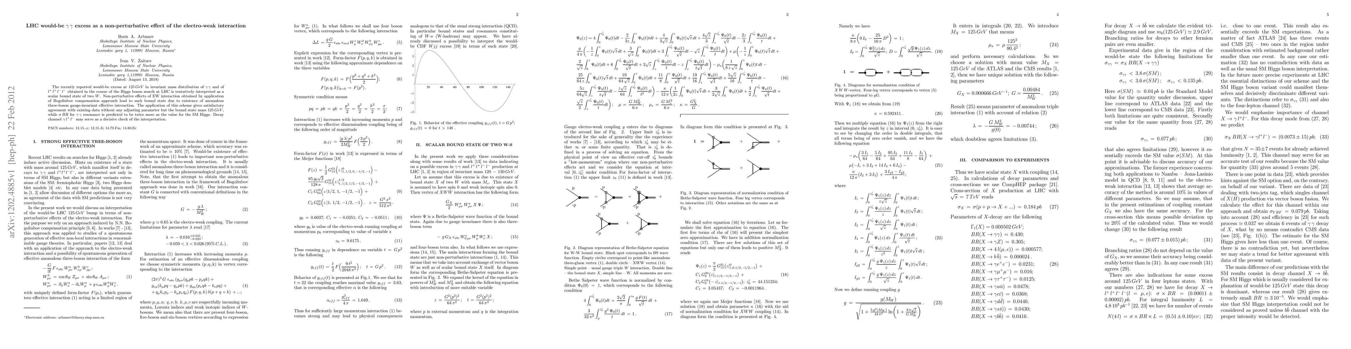 The recently reported would-be excess at $125\, GeV$ in invariant mass distribution of $\gamma\, \gamma$ and of $l^+\,l^+\,l^-\,l^-$ obtained in the course of the Higgs boson search at LHC is tentatively interpreted as a scalar bound state of two $W$. Non-perturbative effects of EW interaction obtained by application of Bogoliubov compensation approach lead to such bound state due to existence of anomalous three-boson gauge-invariant effective interaction. The application of this scheme gives satisfactory agreement with existing data without any adjusting parameter but the bound state mass $125\,GeV$, while $\sigma\,BR$ for $\gamma\,\gamma$ resonance is predicted to be twice more as the value for the SM Higgs. Decay channel $\gamma\,l^+\,l^-$ may serve as a decisive check of the interpretation.