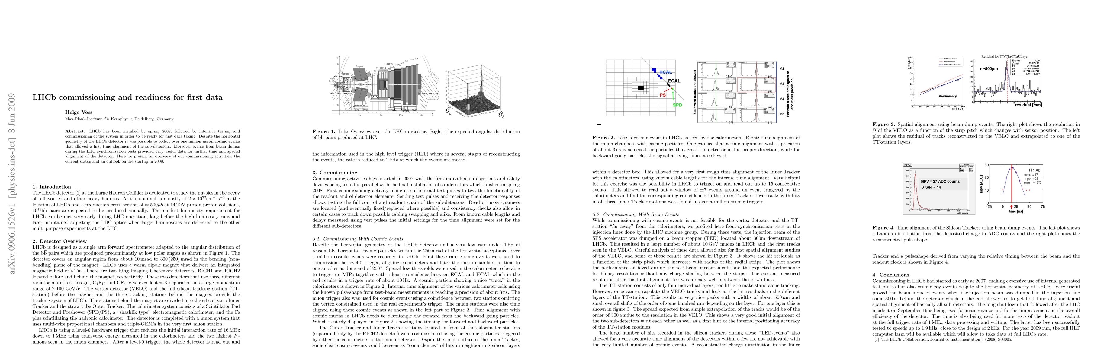 The LHCb detector was installed and underwent extensive commissioning by spring 2008, enabling the collection of over one million cosmic events for initial alignment. Beam dump events during LHC synchronization tests provided additional data for further detector alignment, with preparations complete for startup in 2009.