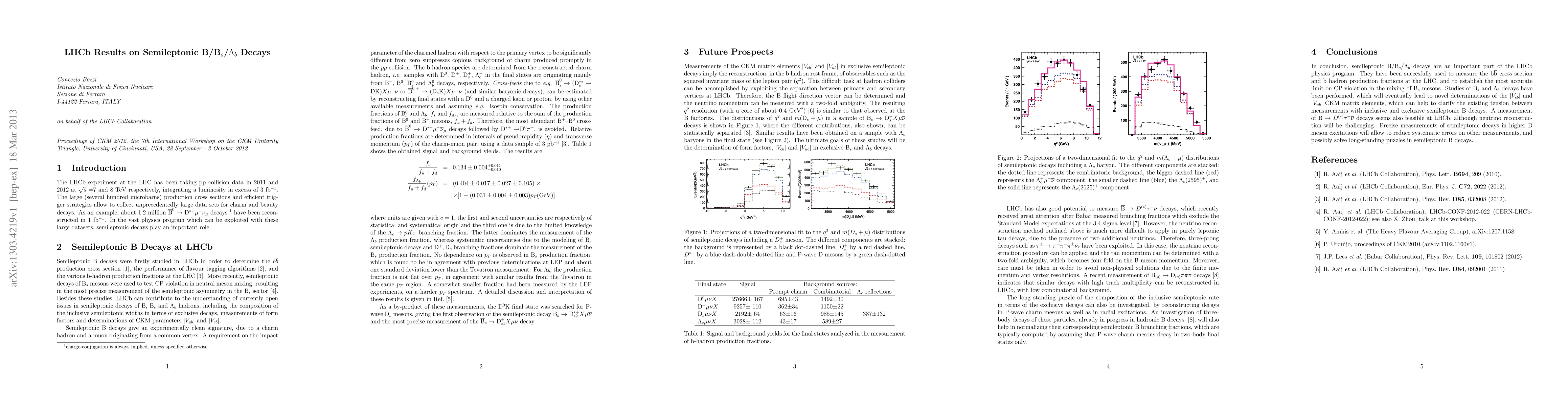 The LHCb experiment studied semileptonic decays of b hadrons, measuring production fractions of b hadrons at the LHC and Bs semileptonic decays in P-wave charmed mesons. Cross-feeds were estimated by reconstructing final states with a D⁺ and a charged kaon or proton, using other available measurements and assuming isospin conservation.