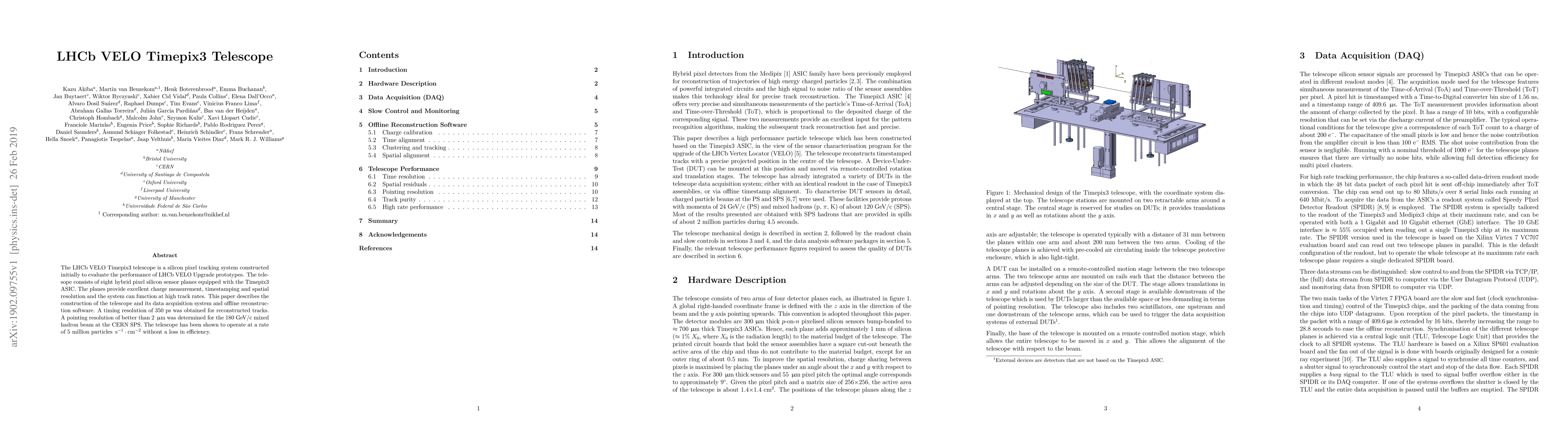 The LHCb VELO Timepix3 telescope is a high-performance silicon pixel tracking system designed for the LHCb experiment, achieving a timing resolution of 350 ps and a pointing resolution of better than 2 µm for 180 GeV/c hadron beams, while operating efficiently at track rates of 5 million particles/s/cm².