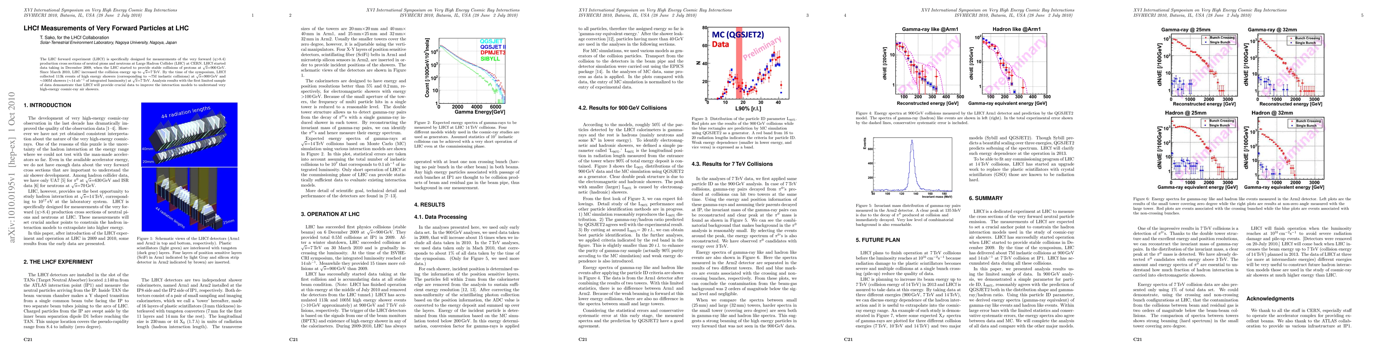 The LHC forward experiment (LHCf) is specifically designed for measurements of the very forward ($\eta$$>$8.4) production cross sections of neutral pions and neutrons at Large Hadron Collider (LHC) at CERN. LHCf started data taking in December 2009, when the LHC started to provide stable collisions of protons at $\sqrt{s}$=900\,GeV. Since March 2010, LHC increased the collision energy up to $\sqrt{s}$=7\,TeV. By the time of the symposium, LHCf collected 113k events of high energy showers (corresponding to $\sim$7M inelastic collisions) at $\sqrt{s}$=900\,GeV and $\sim$100M showers ($\sim$14 nb$^{-1}$ of integrated luminosity) at $\sqrt{s}$=7\,TeV. Analysis results with the first limited sample of data demonstrate that LHCf will provide crucial data to improve the interaction models to understand very high-energy cosmic-ray air showers.