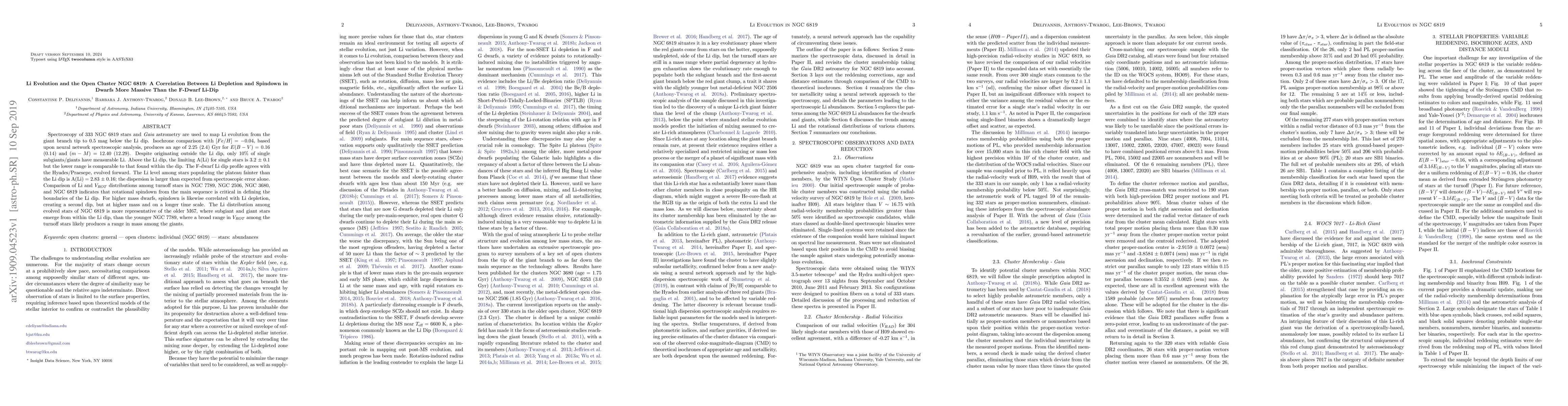 Spectroscopy of 333 NGC 6819 stars and Gaia astrometry are used to map Li evolution from the giant branch tip to 0.5 mag below the Li dip. Isochrone comparison with [Fe/H] = -0.04, based upon neural network spectroscopic analysis, produces an age of 2.25 (2.4) Gyr for E(B-V) = 0.16 (0.14) and (m-M) = 12.40 (12.29). Despite originating outside the Li dip, only 10% of single subgiants/giants have measurable Li. Above the Li dip, the limiting A(Li) for single stars is 3.2 +/- 0.1 but the lower range is comparable to that found within the dip. The F-dwarf Li dip profile agrees with the Hyades/Praesepe, evolved forward. The Li level among stars populating the plateau fainter than the Li dip is A(Li) = 2.83 +/- 0.16; the dispersion is larger than expected from spectroscopic error alone. Comparison of Li and V_ROT distributions among turnoff stars in NGC 7789, NGC 2506, NGC 3680, and NGC 6819 indicates that rotational spindown from the main sequence is critical in defining the boundaries of the Li dip. For higher mass dwarfs, spindown is likewise correlated with Li depletion, creating a second dip, but at higher mass and on a longer time scale. The Li distribution among evolved stars of NGC 6819 is more representative of the older M67, where subgiant and giant stars emerge from within the Li dip, than the younger NGC 7789, where a broad range in V_ROT among the turnoff stars likely produces a range in mass among the giants.