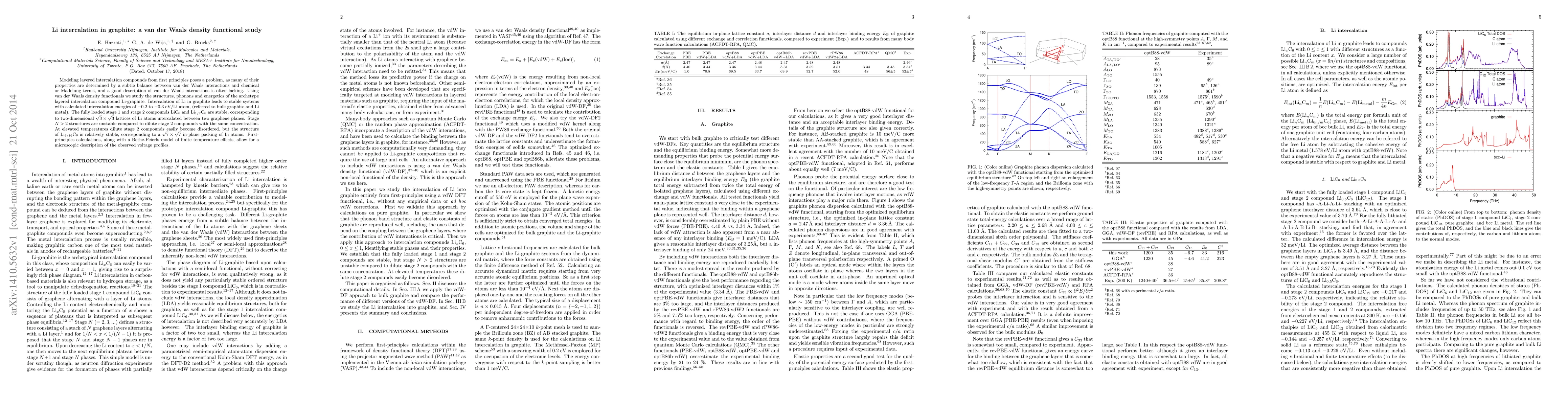 Modeling layered intercalation compounds from first principles poses a problem, as many of their properties are determined by a subtle balance between van der Waals interactions and chemical or Madelung terms, and a good description of van der Waals interactions is often lacking. Using van der Waals density functionals we study the structures, phonons and energetics of the archetype layered intercalation compound Li-graphite. Intercalation of Li in graphite leads to stable systems with calculated intercalation energies of $-0.2$ to $-0.3$~eV/Li atom, (referred to bulk graphite and Li metal). The fully loaded stage 1 and stage 2 compounds LiC$_6$ and Li$_{1/2}$C$_6$ are stable, corresponding to two-dimensional $\sqrt3\times\sqrt3$ lattices of Li atoms intercalated between two graphene planes. Stage $N>2$ structures are unstable compared to dilute stage 2 compounds with the same concentration. At elevated temperatures dilute stage 2 compounds easily become disordered, but the structure of Li$_{3/16}$C$_6$ is relatively stable, corresponding to a $\sqrt7\times\sqrt7$ in-plane packing of Li atoms. First-principles calculations, along with a Bethe-Peierls model of finite temperature effects, allow for a microscopic description of the observed voltage profiles.