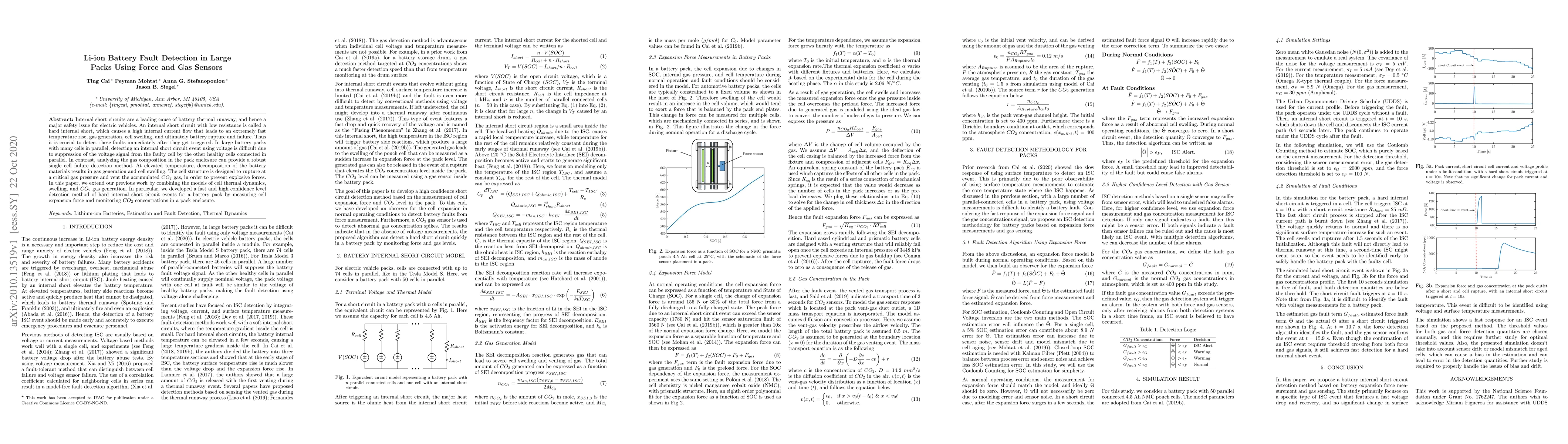 This paper proposes a method for detecting hard internal short circuits in large Li-ion battery packs by measuring cell expansion force and monitoring $CO_2$ gas concentrations. This approach provides a robust detection mechanism, overcoming the limitations of voltage-based detection in parallel cell configurations.