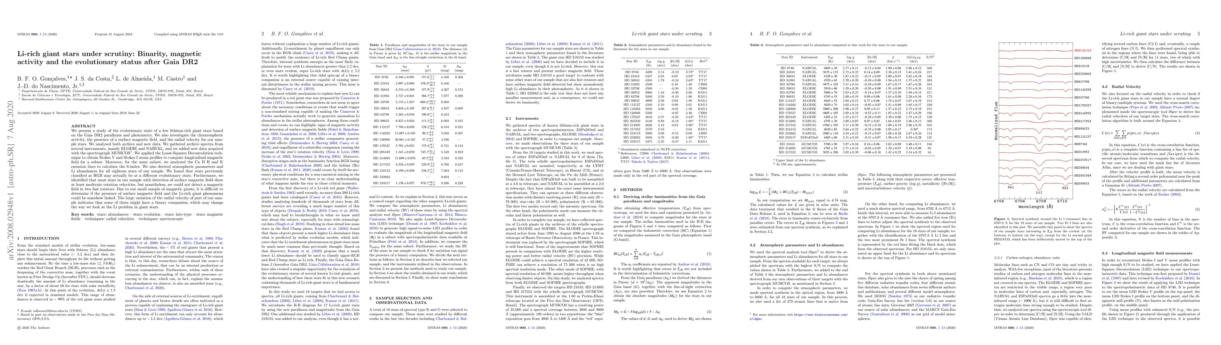 We present a study of the evolutionary state of a few lithium-rich giant stars based on the Gaia DR2 parallaxes and photometry. We also investigate the chromospheric activity, the presence of a surface magnetic field, and the radial velocity for our sample stars. We analysed both archive and new data. We gathered archive spectra from several instruments, mainly ELODIE and NARVAL, and we added new data acquired with the spectrograph MUSICOS. We applied the Least-Squares Deconvolution technique to obtain Stokes V and Stokes I mean profiles to compute longitudinal magnetic field for a subset. Moreover, for the same subset, we analysed the Ca II H and K emission lines to calculate the S-index. We also derived atmospheric parameters and Li abundances for all eighteen stars of our sample. We found that stars previously classified as RGB may actually be at a different evolutionary state. Furthermore, we identified that most stars in our sample with detection of surface magnetic field show at least moderate rotation velocities, but nonetheless, we could not detect a magnetic field in two fast rotators. Due to our small sample of magnetic giants, it is difficult to determine if the presence of surface magnetic field and the Li-rich giant phenomena could be somehow linked. The large variation of the radial velocity of part of our sample indicates that some of them might have a binary companion, which may change the way we look at the Li problem in giant stars.
