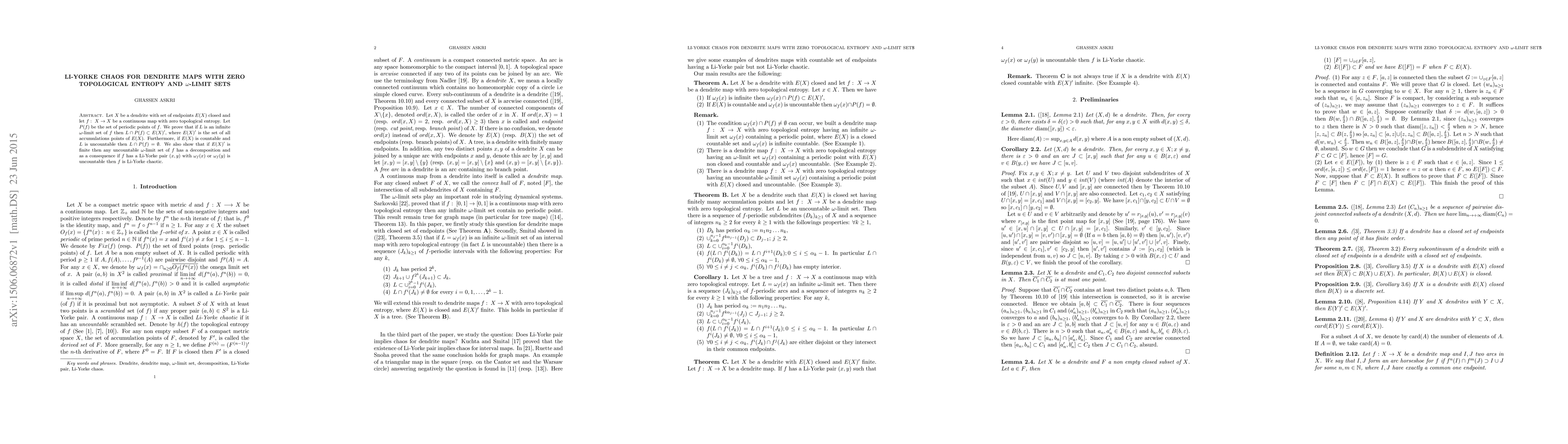 Let $X$ be a dendrite with set of endpoints $E(X)$ closed and let $f:~X \to X$ be a continuous map with zero topological entropy. Let $P(f)$ be the set of periodic points of $f$. We prove that if $L$ is an infinite $\omega$-limit set of $f$ then $L\cap P(f)\subset E(X)^{\prime}$, where $E(X)^{\prime}$ is the set of all accumulations points of $E(X)$. Furthermore, if $E(X)$ is countable and $L$ is uncountable then $L\cap P(f)=\emptyset$. We also show that if $E(X)^{\prime}$ is finite then any uncountable $\omega$-limit set of $f$ has a decomposition and as a consequence if $f$ has a Li-Yorke pair $(x,y)$ with $\omega\_f(x)$ or $\omega\_f(y)$ is uncountable then $f$ is Li-Yorke chaotic.