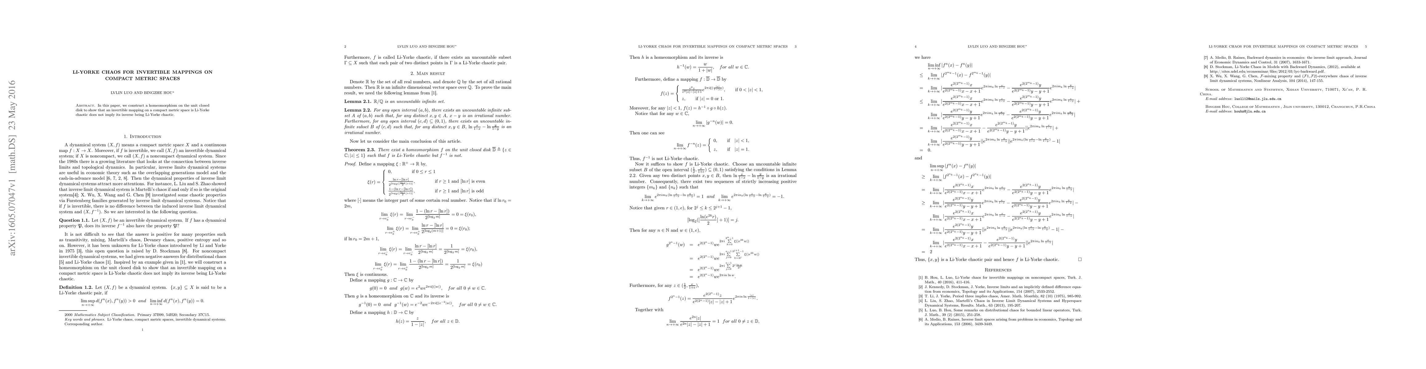 This paper demonstrates that an invertible mapping on a compact metric space exhibiting Li-Yorke chaos does not necessarily imply that its inverse also exhibits Li-Yorke chaos, using a specific homeomorphism on the unit closed disk as an example.