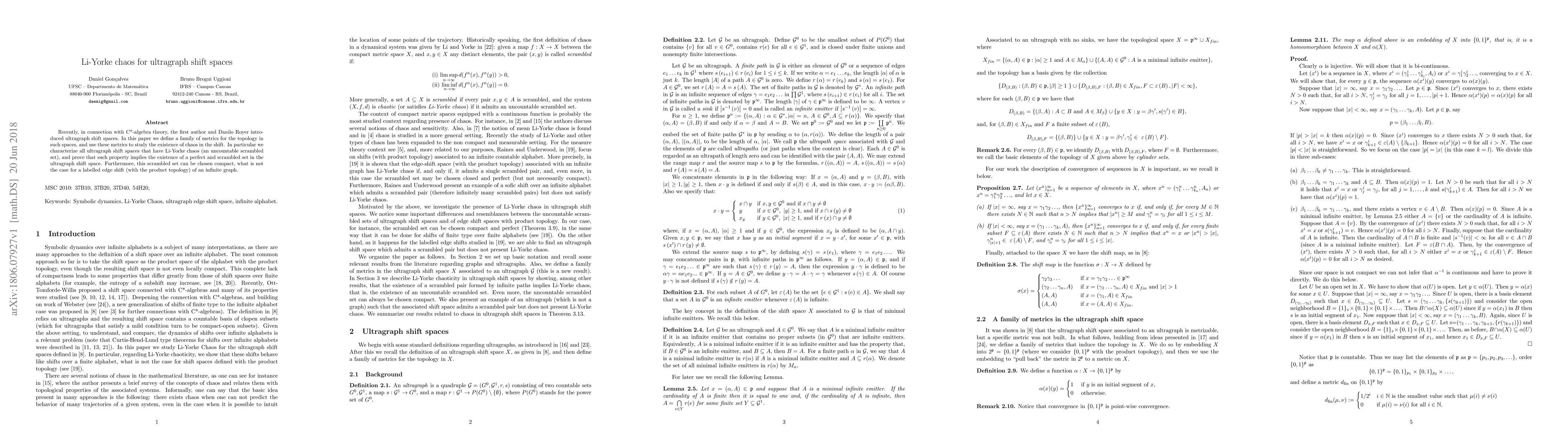 This paper introduces metrics for ultragraph shift spaces and demonstrates the presence of Li-Yorke chaos, showing the existence of an uncountable scrambled set and a perfect, compact scrambled set, a property not found in labelled edge shifts of infinite graphs.