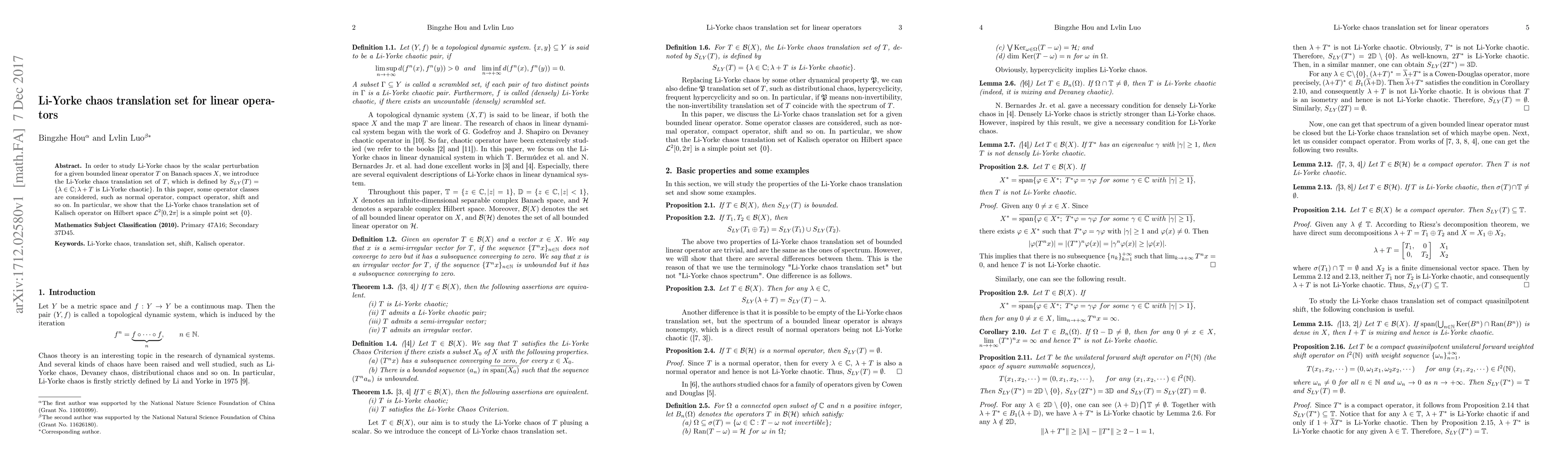 Summary: This paper introduces the Li-Yorke chaos translation set for bounded linear operators on Banach spaces, defined as the set of scalar perturbations that induce Li-Yorke chaos. It examines various operator classes and demonstrates that the Li-Yorke chaos translation set for the Kalisch operator on the Hilbert space $\mathcal{L}^2[0,2\pi]$ is the singleton set $\{0\}$.