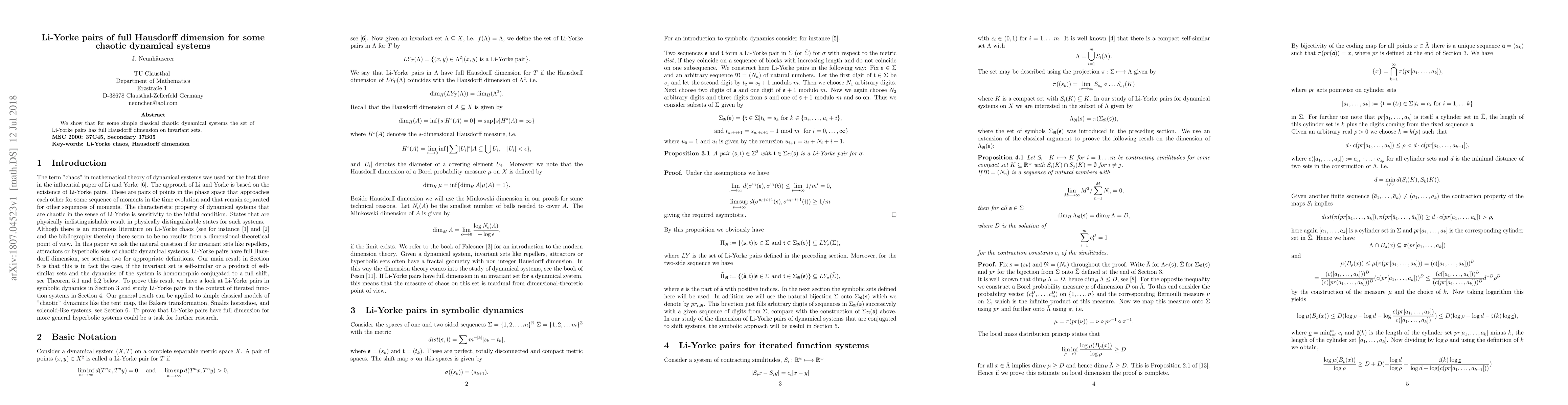 Summary: This paper demonstrates that certain simple classical chaotic dynamical systems exhibit Li-Yorke pairs with full Hausdorff dimension on their invariant sets, highlighting the complexity of their chaotic behavior.