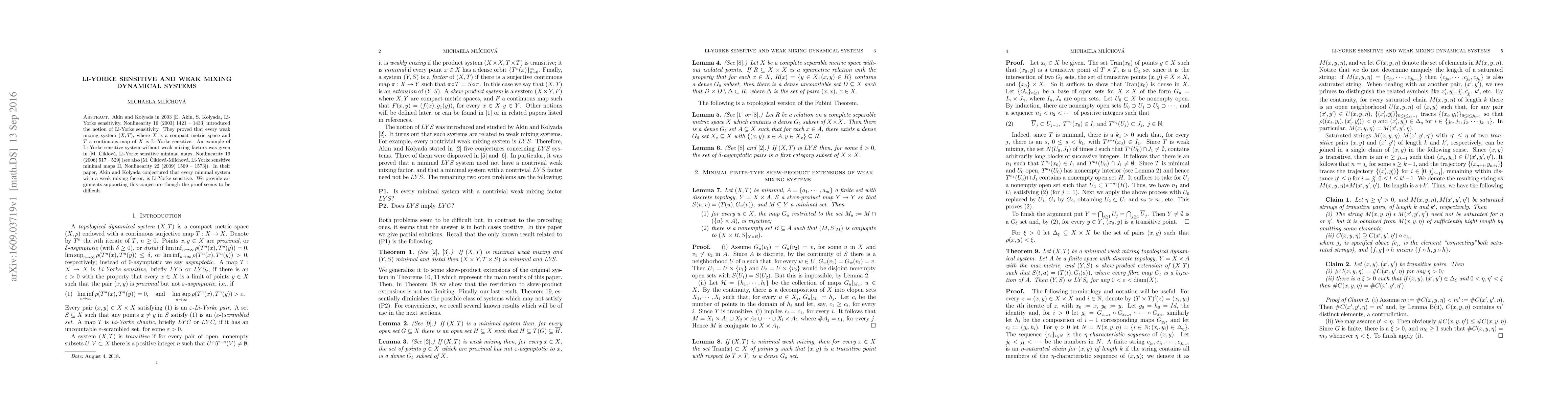 Akin and Kolyada in 2003 [E. Akin, S. Kolyada, Li-Yorke sensitivity, Nonlinearity 16 (2003) 1421 - 1433] introduced the notion of Li-Yorke sensitivity. They proved that every weak mixing system $(X, T)$, where $X$ is a compact metric space and $T$ a continuous map of $X$ is Li-Yorke sensitive. An example of Li-Yorke sensitive system without weak mixing factors was given in [M. \v{C}iklov\'a, Li-Yorke sensitive minimal maps, Nonlinearity 19 (2006) 517 - 529] (see also [M. \v{C}iklov\'a-Ml\'{\i}chov\'a, Li-Yorke sensitive minimal maps II, Nonlinearity 22 (2009) 1569 -1573]). In their paper, Akin and Kolyada conjectured that every minimal system with a weak mixing factor, is Li-Yorke sensitive. We provide arguments supporting this conjecture though the proof seems to be difficult.