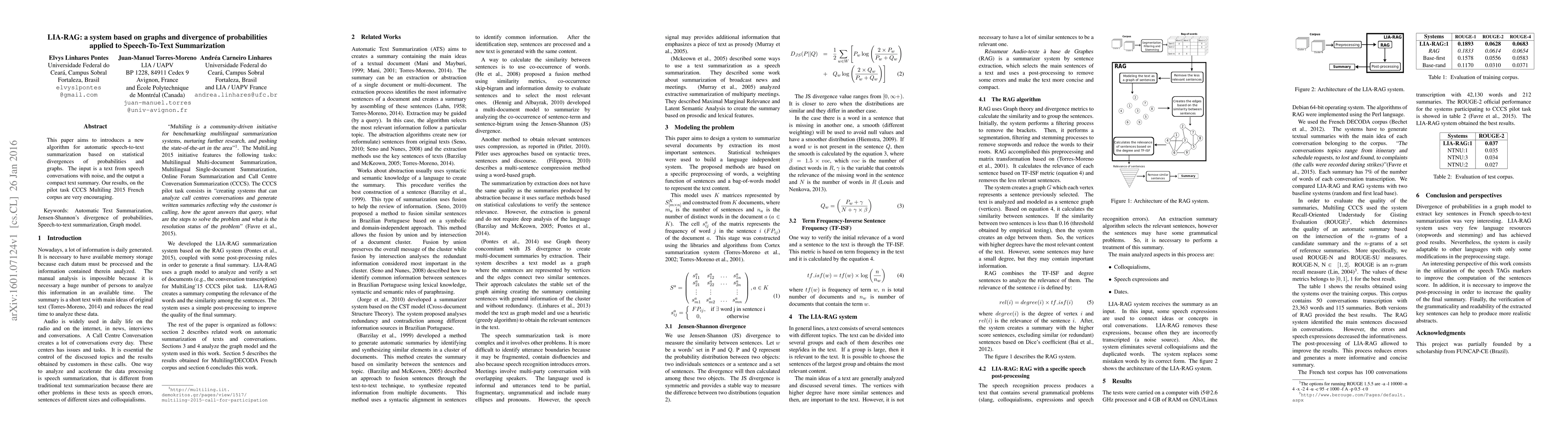This paper aims to introduces a new algorithm for automatic speech-to-text summarization based on statistical divergences of probabilities and graphs. The input is a text from speech conversations with noise, and the output a compact text summary. Our results, on the pilot task CCCS Multiling 2015 French corpus are very encouraging