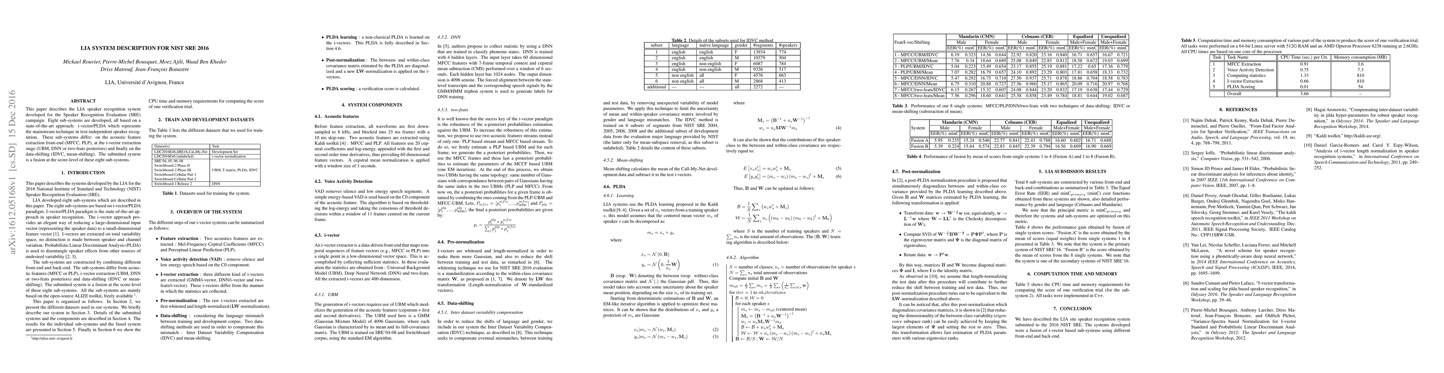 This paper describes the LIA speaker recognition system developed for the Speaker Recognition Evaluation (SRE) campaign. Eight sub-systems are developed, all based on a state-of-the-art approach: i-vector/PLDA which represents the mainstream technique in text-independent speaker recognition. These sub-systems differ: on the acoustic feature extraction front-end (MFCC, PLP), at the i-vector extraction stage (UBM, DNN or two-feats posteriors) and finally on the data-shifting (IDVC, mean-shifting). The submitted system is a fusion at the score-level of these eight sub-systems.