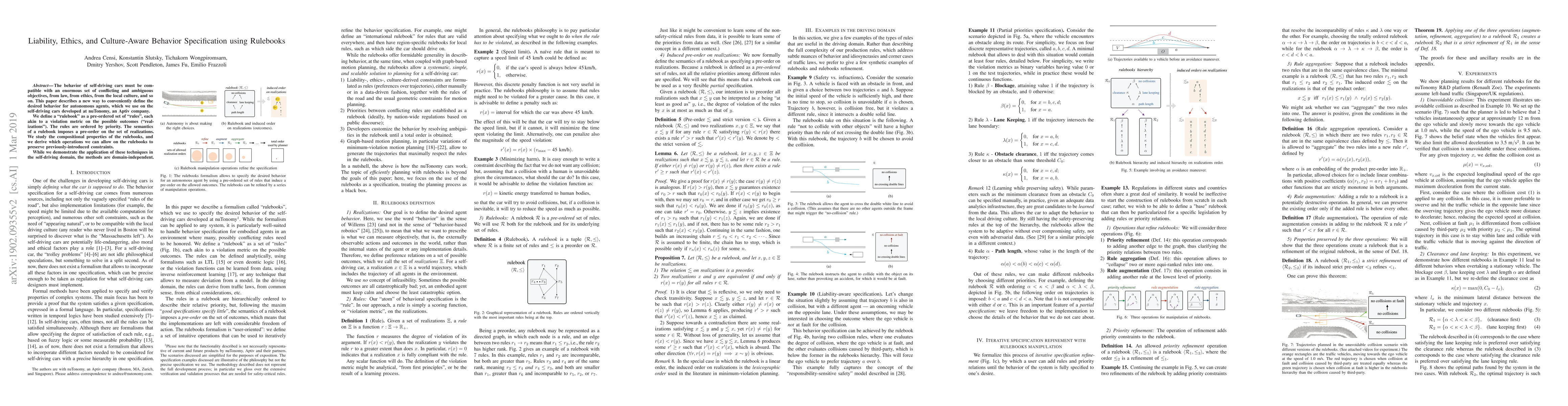 This paper proposes a "rulebook" system to define and manage the behavior of autonomous vehicles, prioritizing conflicting objectives from law, ethics, and culture. The method ensures compositional properties and preserves constraints, demonstrating its application in self-driving cars while being domain-independent.