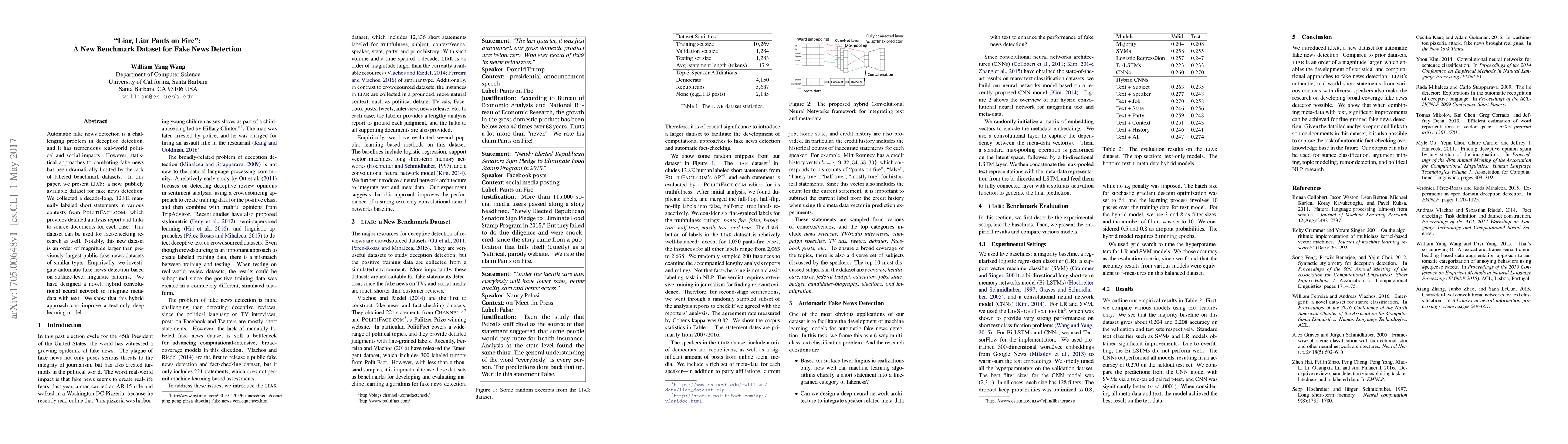 This paper introduces "liar," a new, comprehensive dataset of 12.8K manually labeled fake news statements from PolitiFact.com, aimed at advancing automatic fake news detection. The authors also propose a hybrid convolutional neural network integrating metadata with text, demonstrating improved detection performance compared to text-only models.