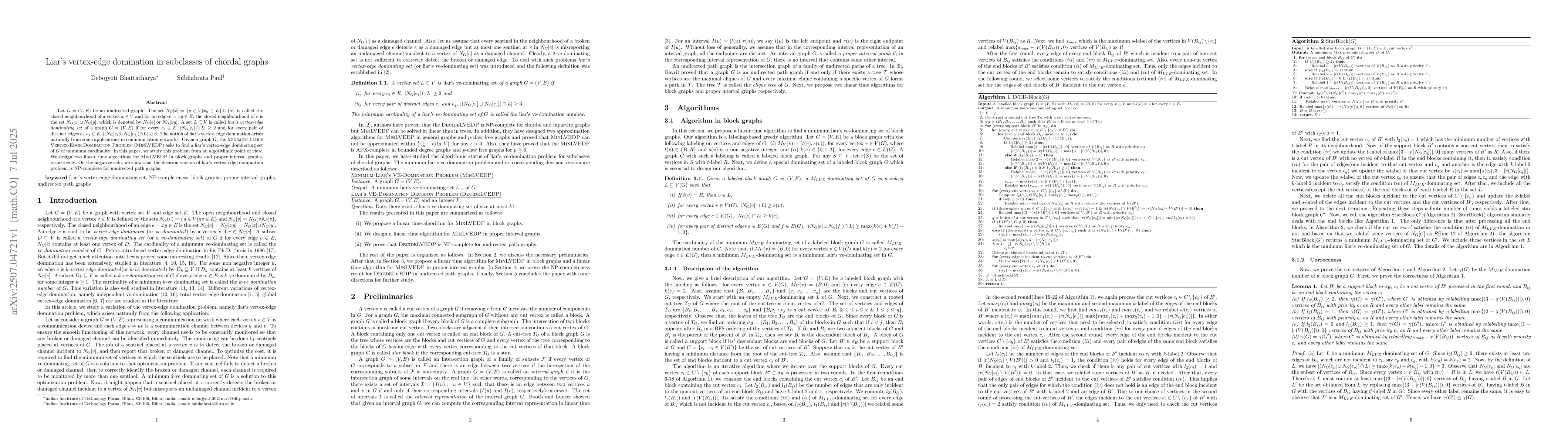 Let $G=(V, E)$ be an undirected graph. The set $N_G[x]=\{y\in V|xy\in E\}\cup \{x\}$ is called the closed neighbourhood of a vertex $x\in V$ and for an edge $e=xy\in E$, the closed neighbourhood of $e$ is the set $N_G[x]\cup N_G[y]$, which is denoted by $N_G[e]$ or $N_G[xy]$. A set $L\subseteq V$ is called \emph{liar's vertex-edge dominating set} of a graph $G=(V,E)$ if for every $e_i\in E$, $|N_G[e_i]\cap L|\geq 2$ and for every pair of distinct edges $e_i,e_j\in E$, $|(N_G[e_i]\cup N_G[e_j])\cap L|\geq 3$. The notion of liar's vertex-edge domination arises naturally from some applications in communication networks. Given a graph $G$, the \textsc{Minimum Liar's Vertex-Edge Domination Problem} (\textsc{MinLVEDP}) asks to find a liar's vertex-edge dominating set of $G$ of minimum cardinality. In this paper, we study this problem from an algorithmic point of view. We design two linear time algorithms for \textsc{MinLVEDP} in block graphs and proper interval graphs, respectively. On the negative side, we show that the decision version of liar's vertex-edge domination problem is NP-complete for undirected path graphs.