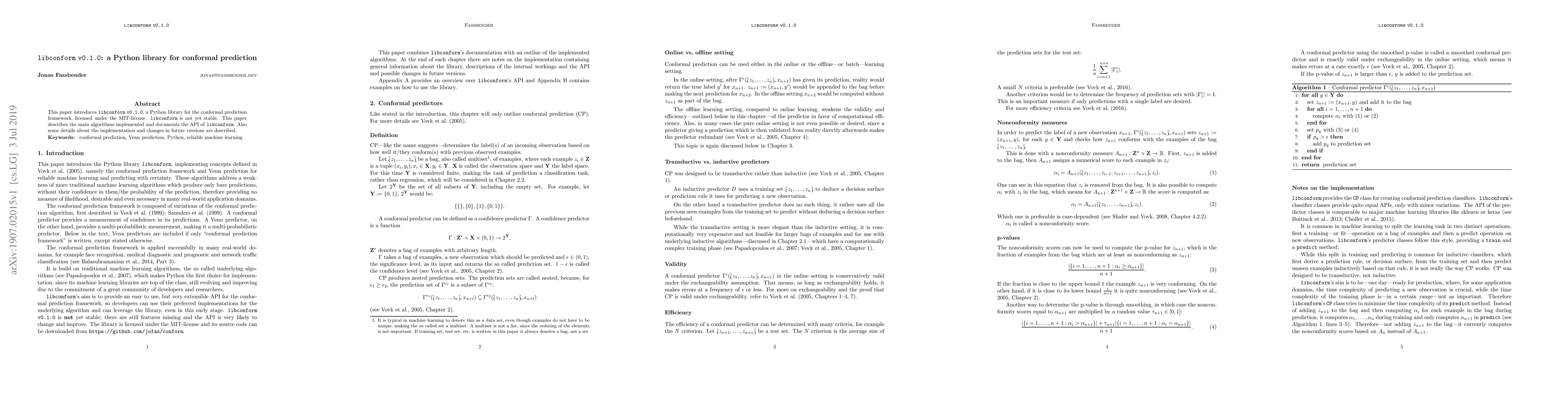 This paper introduces libconform v0.1.0, a Python library for the conformal prediction framework, licensed under the MIT-license. libconform is not yet stable. This paper describes the main algorithms implemented and documents the API of libconform. Also some details about the implementation and changes in future versions are described.