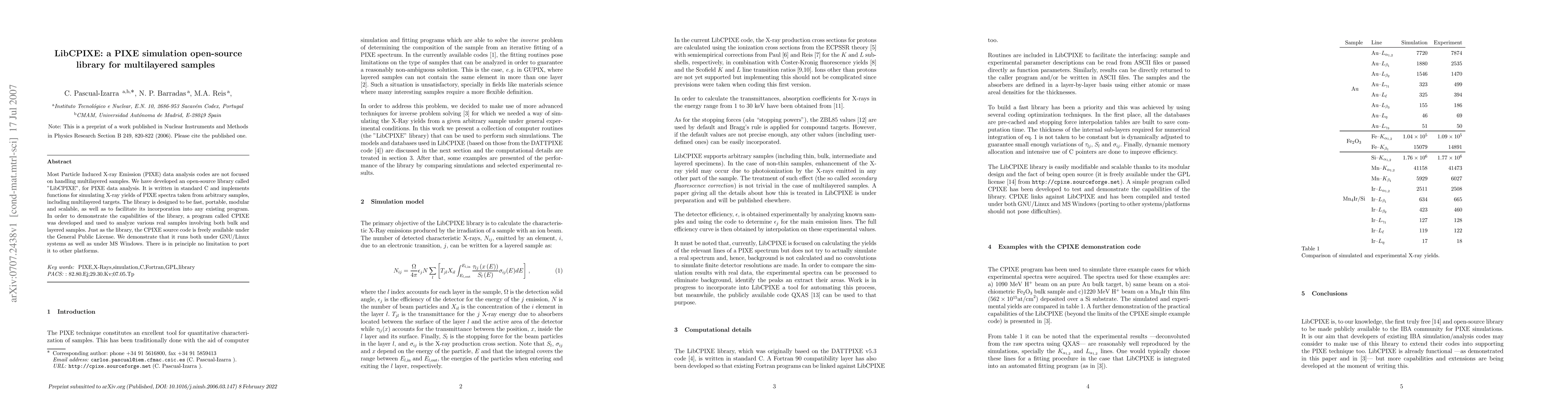LibCPIXE is an open-source C library for simulating PIXE data analysis, specifically designed to handle multilayered samples. It is fast, portable, and scalable, and its source code is freely available under the General Public License.