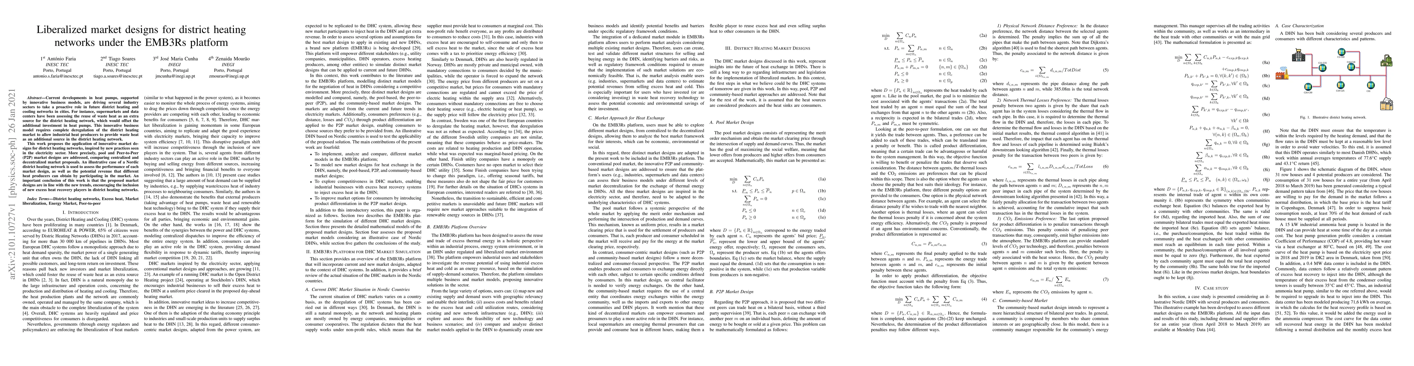 The paper presents innovative market designs for district heating networks, incorporating product differentiation based on distance, thermal losses, or CO2 emissions, and simulating these designs using the EMB3Rs platform.