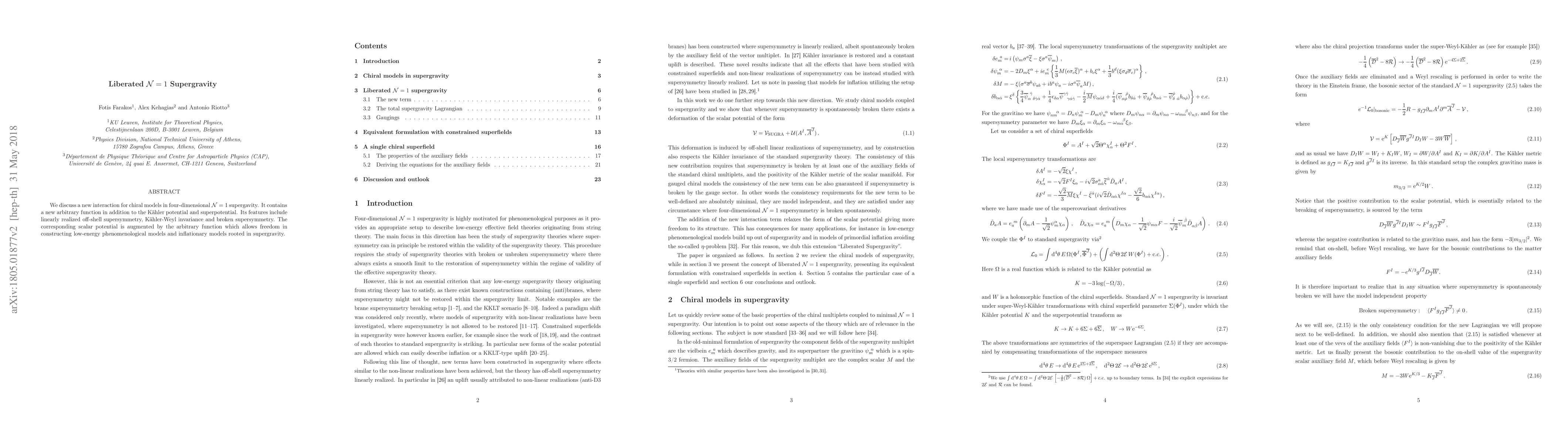We discuss a new interaction for chiral models in four-dimensional ${\cal N}=1$ supergavity. It contains a new arbitrary function in addition to the K\"ahler potential and superpotential. Its features include linearly realized off-shell supersymmetry, K\"ahler-Weyl invariance and broken supersymmetry. The corresponding scalar potential is augmented by the arbitrary function which allows freedom in constructing low-energy phenomenological models and inflationary models rooted in supergravity.