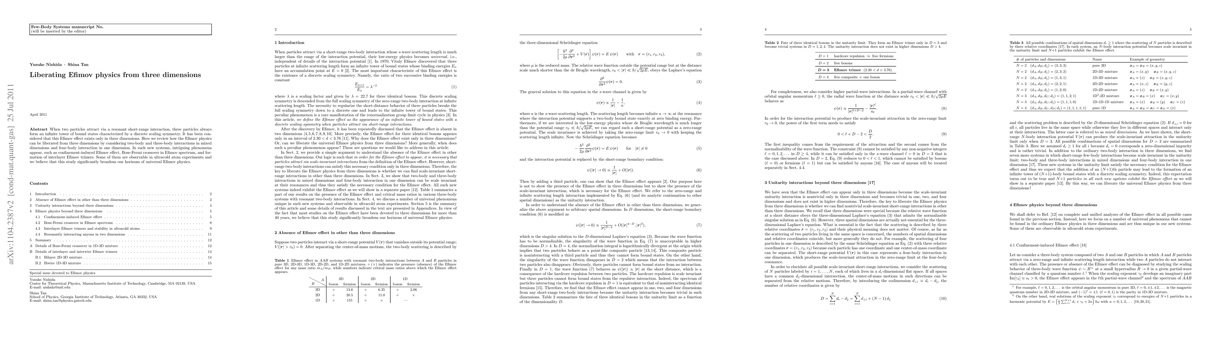 When two particles attract via a resonant short-range interaction, three particles always form an infinite tower of bound states characterized by a discrete scaling symmetry. It has been considered that this Efimov effect exists only in three dimensions. Here we review how the Efimov physics can be liberated from three dimensions by considering two-body and three-body interactions in mixed dimensions and four-body interaction in one dimension. In such new systems, intriguing phenomena appear, such as confinement-induced Efimov effect, Bose-Fermi crossover in Efimov spectrum, and formation of interlayer Efimov trimers. Some of them are observable in ultracold atom experiments and we believe that this study significantly broadens our horizons of universal Efimov physics.
