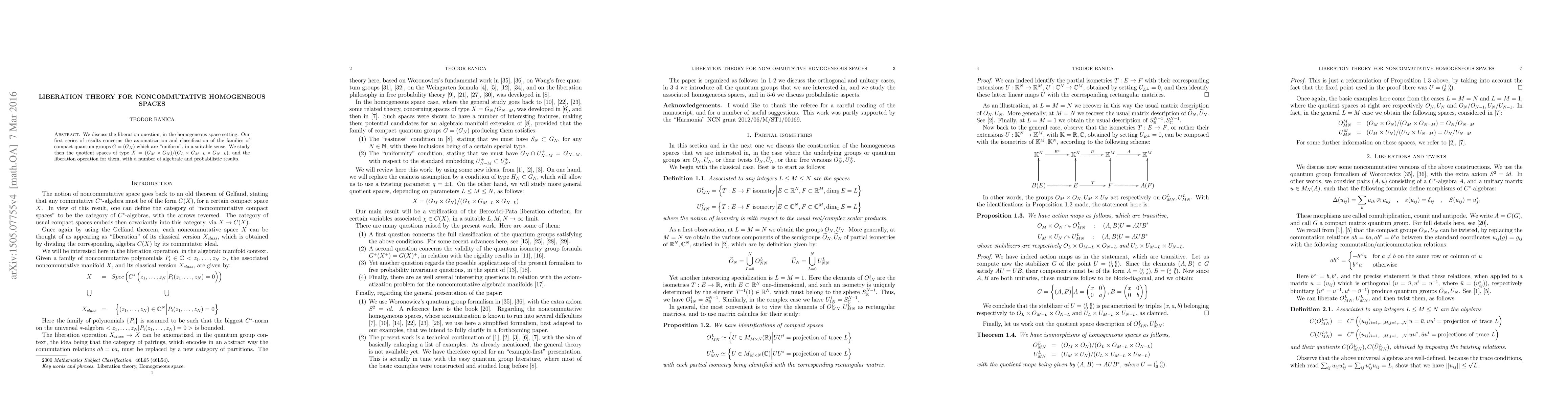 We discuss the liberation question, in the homogeneous space setting. Our first series of results concerns the axiomatization and classification of the families of compact quantum groups $G=(G_N)$ which are "uniform", in a suitable sense. We study then the quotient spaces of type $X=(G_M\times G_N)/(G_L\times G_{M-L}\times G_{N-L})$, and the liberation operation for them, with a number of algebraic and probabilistic results.