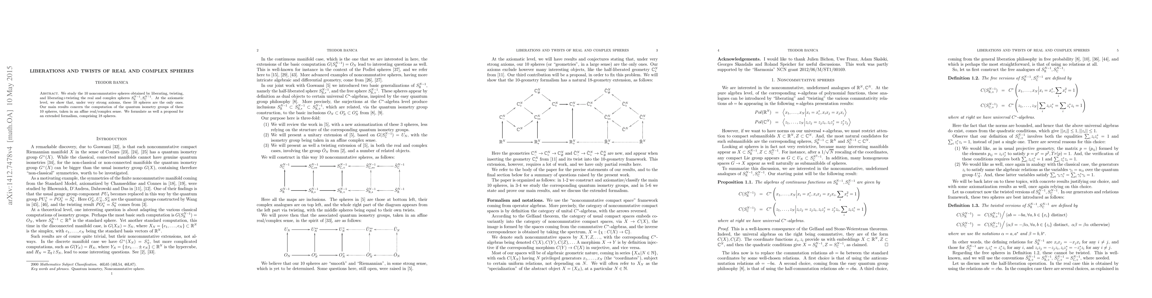 We study the 10 noncommutative spheres obtained by liberating, twisting, and liberating+twisting the real and complex spheres $S^{N-1}_\mathbb R,S^{N-1}_\mathbb C$. At the axiomatic level, we show that, under very strong axioms, these 10 spheres are the only ones. Our main results concern the computation of the quantum isometry groups of these 10 spheres, taken in an affine real/complex sense. We formulate as well a proposal for an extended formalism, comprising 18 spheres.