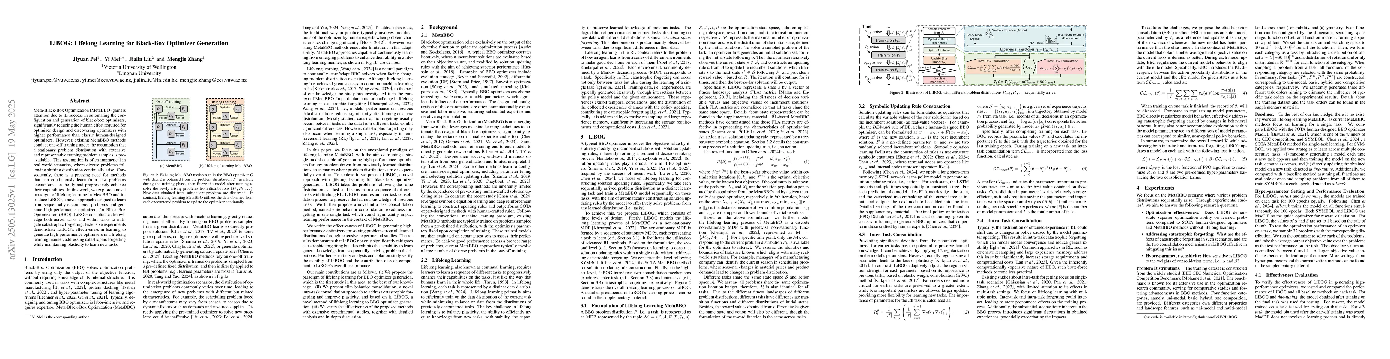 LiBOG presents a novel lifelong learning framework specifically designed for MetaBBO, incorporating cross-task and within-task knowledge consolidation to overcome catastrophic forgetting.