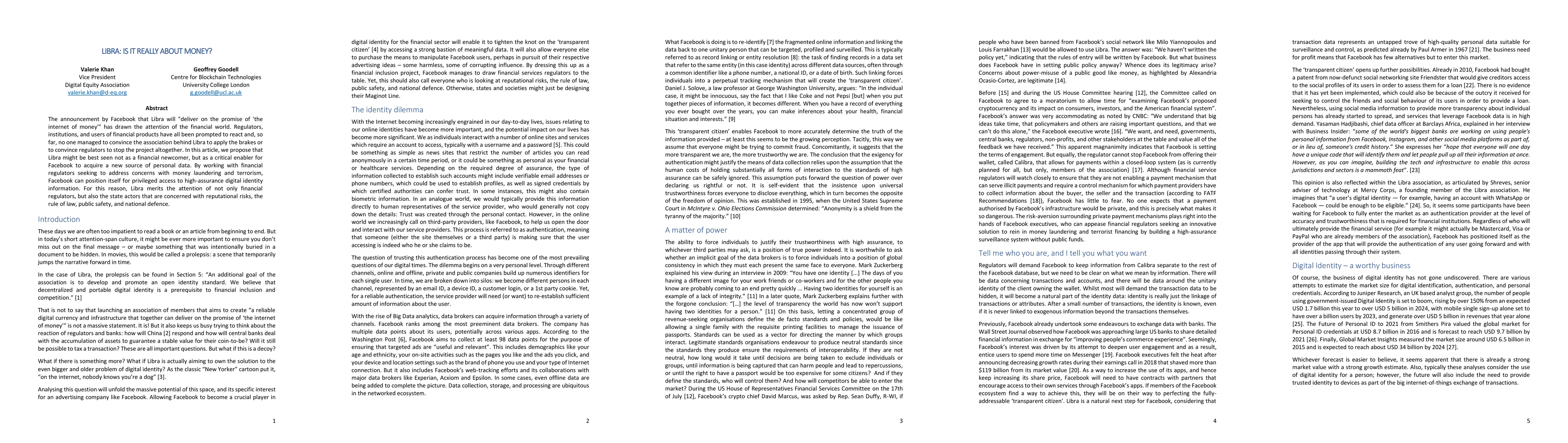 The announcement by Facebook that Libra will "deliver on the promise of 'the internet of money'" has drawn the attention of the financial world. Regulators, institutions, and users of financial products have all been prompted to react and, so far, no one managed to convince the association behind Libra to apply the brakes or to convince regulators to stop the project altogether. In this article, we propose that Libra might be best seen not as a financial newcomer, but as a critical enabler for Facebook to acquire a new source of personal data. By working with financial regulators seeking to address concerns with money laundering and terrorism, Facebook can position itself for privileged access to high-assurance digital identity information. For this reason, Libra merits the attention of not only financial regulators, but also the state actors that are concerned with reputational risks, the rule of law, public safety, and national defence.
