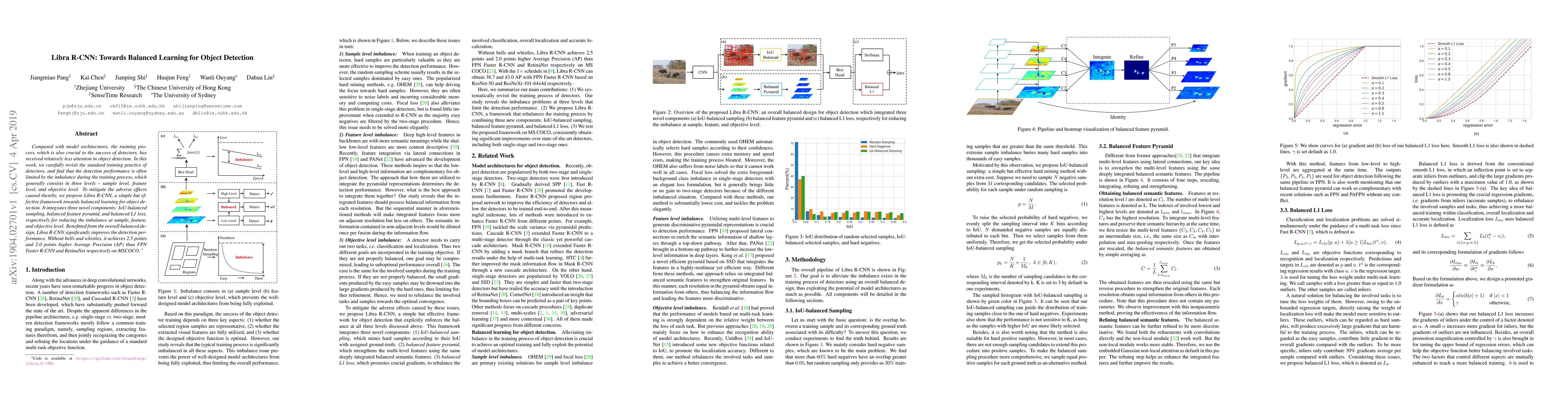 Libra R-CNN addresses the imbalance during the training process in object detection, proposing a balanced learning framework that includes IoU-balanced sampling, a balanced feature pyramid, and a balanced L1 loss. This balanced approach significantly enhances detection performance, achieving notable improvements over FPN Faster R-CNN and RetinaNet on MSCOCO.