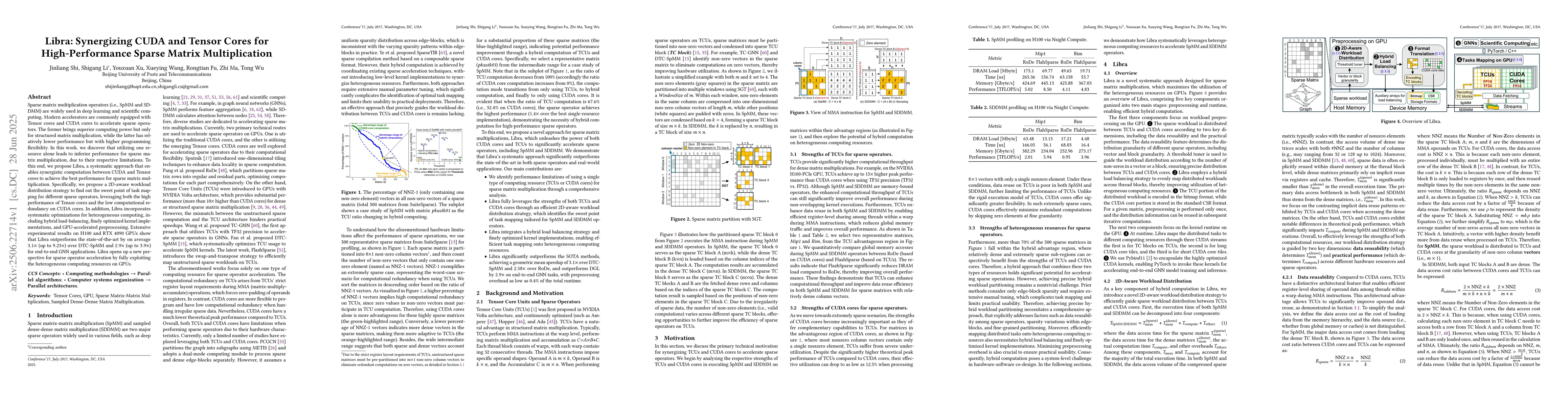 Sparse matrix multiplication operators (i.e., SpMM and SDDMM) are widely used in deep learning and scientific computing. Modern accelerators are commonly equipped with Tensor cores and CUDA cores to accelerate sparse operators. The former brings superior computing power but only for structured matrix multiplication, while the latter has relatively lower performance but with higher programming flexibility. In this work, we discover that utilizing one resource alone leads to inferior performance for sparse matrix multiplication, due to their respective limitations. To this end, we propose Libra, a systematic approach that enables synergistic computation between CUDA and Tensor cores to achieve the best performance for sparse matrix multiplication. Specifically, we propose a 2D-aware workload distribution strategy to find out the sweet point of task mapping for different sparse operators, leveraging both the high performance of Tensor cores and the low computational redundancy on CUDA cores. In addition, Libra incorporates systematic optimizations for heterogeneous computing, including hybrid load-balancing, finely optimized kernel implementations, and GPU-accelerated preprocessing. Extensive experimental results on H100 and RTX 4090 GPUs show that Libra outperforms the state-of-the-art by on average 3.1x (up to 9.23x) over DTC-SpMM and 2.9x (up to 3.9x) for end-to-end GNN applications. Libra opens up a new perspective for sparse operator acceleration by fully exploiting the heterogeneous computing resources on GPUs.