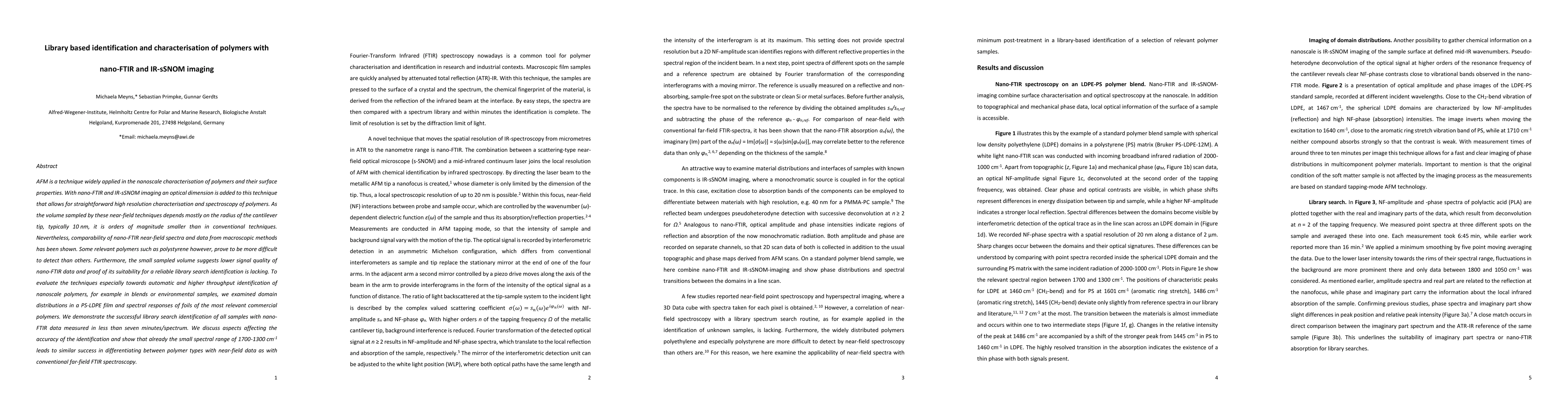 This paper explores the use of nano-FTIR and IR-sSNOM imaging for high-resolution characterization of polymers, demonstrating successful library-based identification of commercial polymers within seven minutes per spectrum. The study highlights the potential for these near-field techniques to achieve comparable results to conventional far-field FTIR spectroscopy, despite the smaller sampled volume.