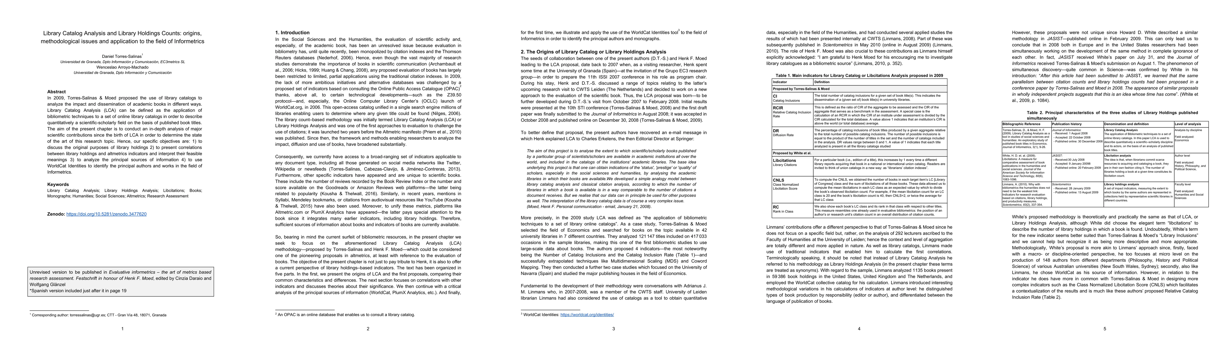 This paper analyzes library catalogs to study scientific contributions, focusing on correlations between book titles and altmetrics indicators, and identifying key authors and works in the field of Informetrics. The research aims to understand the state of the art in Library Catalog Analysis (LCA) and its applications in bibliometrics.