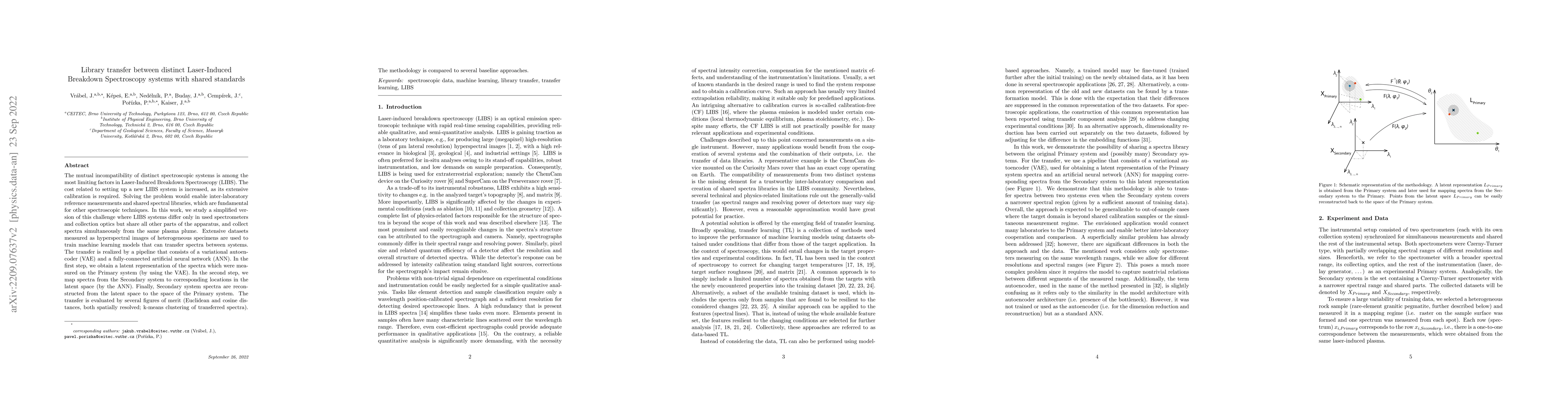 The mutual incompatibility of distinct spectroscopic systems is among the most limiting factors in Laser-Induced Breakdown Spectroscopy (LIBS). The cost related to setting up a new LIBS system is increased, as its extensive calibration is required. Solving the problem would enable inter-laboratory reference measurements and shared spectral libraries, which are fundamental for other spectroscopic techniques. In this work, we study a simplified version of this challenge where LIBS systems differ only in used spectrometers and collection optics but share all other parts of the apparatus, and collect spectra simultaneously from the same plasma plume. Extensive datasets measured as hyperspectral images of heterogeneous specimens are used to train machine learning models that can transfer spectra between systems. The transfer is realized by a pipeline that consists of a variational autoencoder (VAE) and a fully-connected artificial neural network (ANN). In the first step, we obtain a latent representation of the spectra which were measured on the Primary system (by using the VAE). In the second step, we map spectra from the Secondary system to corresponding locations in the latent space (by the ANN). Finally, Secondary system spectra are reconstructed from the latent space to the space of the Primary system. The transfer is evaluated by several figures of merit (Euclidean and cosine distances, both spatially resolved; k-means clustering of transferred spectra). The methodology is compared to several baseline approaches.