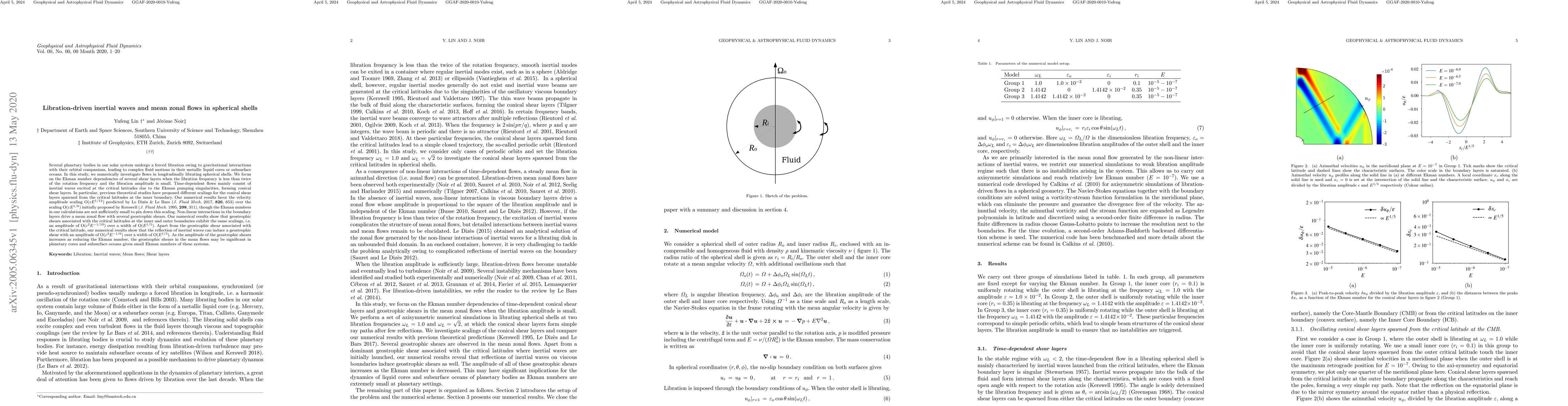 Several planetary bodies in our solar system undergo a forced libration owing to gravitational interactions with their orbital companions, leading to complex fluid motions in their metallic liquid cores or subsurface oceans. In this study, we numerically investigate flows in longitudinally librating spherical shells. We focus on the Ekman number dependencies of several shear layers when the libration frequency is less than twice of the rotation frequency and the libration amplitude is small. Time-dependent flows mainly consist of inertial waves excited at the critical latitudes due to the Ekman pumping singularities, forming conical shear layers. In particular, previous theoretical studies have proposed different scalings for the conical shear layers spawned from the critical latitudes at the inner boundary. Our numerical results favor the velocity amplitude scaling $\mathrm{O}(\varepsilon E^{1/12})$ predicted by Le Diz\`es \& Le Bars (2017) over the scaling $\mathrm{O}(\varepsilon E^{1/6})$ initially proposed by Kerswell (1995), though the Ekman numbers in our calculations are not sufficiently small to pin down this scaling. Non-linear interactions in the boundary layers drive a mean zonal flow with several geostrophic shears. Our numerical results show that geostrophic shears associated with the critical latitudes at the inner and outer boundaries exhibit the same scalings, i.e. an amplitude of $\mathrm{O}(\varepsilon^2 E^{-1/10})$ over a width of $\mathrm{O}(E^{1/5})$. Apart from the geostrophic shear associated with the critical latitude, our numerical results show that the reflection of inertial waves can induce a geostrophic shear with an amplitude of $\mathrm{O}(\varepsilon^2 E^{-1/6})$ over a width of $\mathrm{O}(E^{1/3})$.
