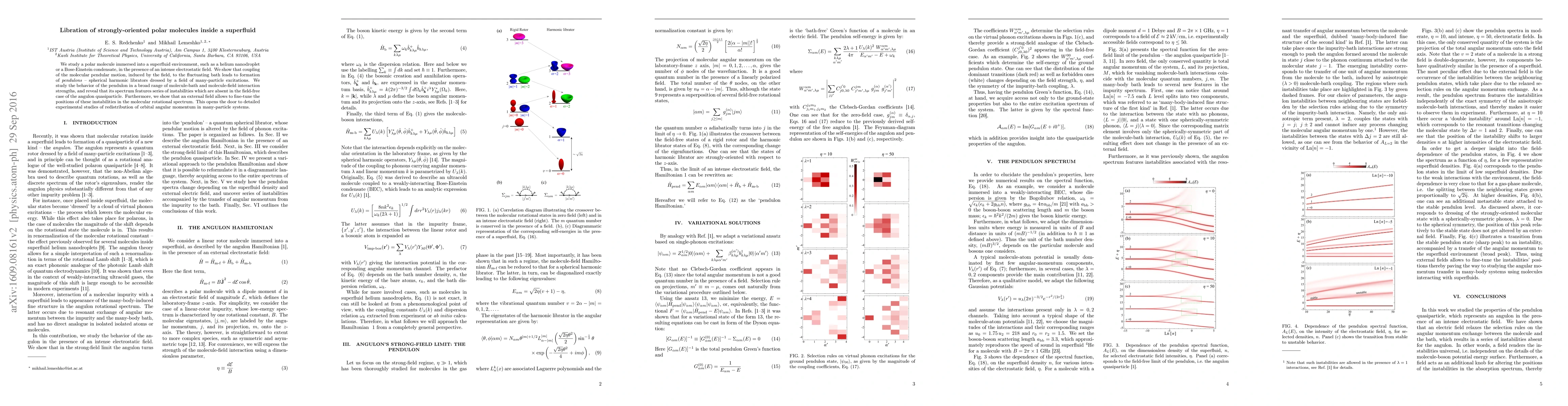 We study a polar molecule immersed into a superfluid environment, such as a helium nanodroplet or a Bose-Einstein condensate, in the presence of an intense electrostatic field. We show that coupling of the molecular pendular motion, induced by the field, to the fluctuating bath leads to formation of pendulons -- spherical harmonic librators dressed by a field of many-particle excitations. We study the behavior of the pendulon in a broad range of molecule-bath and molecule-field interaction strengths, and reveal that its spectrum features series of instabilities which are absent in the field-free case of the angulon quasiparticle. Furthermore, we show that an external field allows to finetune the positions of these instabilities in the molecular rotational spectrum. This opens the door to detailed experimental studies of redistribution of orbital angular momentum in many-particle systems.