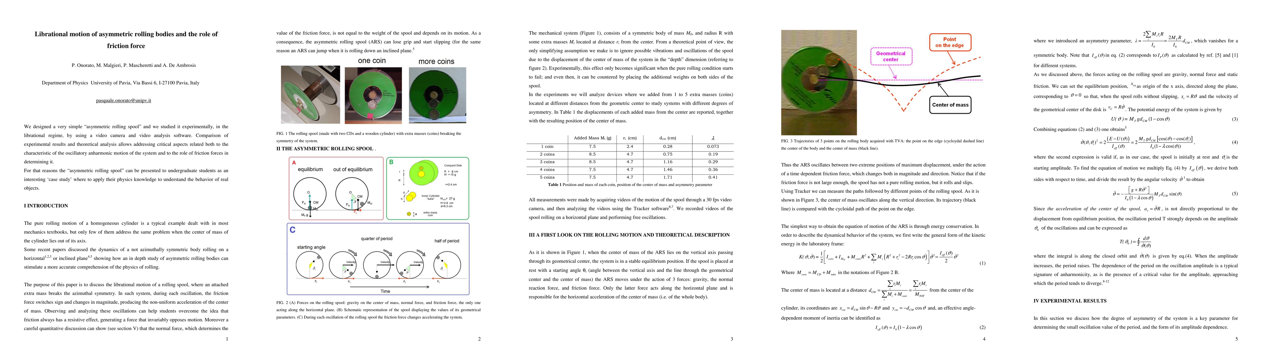 We designed a very simple asymmetric rolling spool and we studied it experimentally, in the librational regime, by using a video camera and video analysis software. Comparison of experimental results and theoretical analysis allows addressing critical aspects related both to the characteristic of the oscillatory anharmonic motion of the system and to the role of friction forces in determining it. For that reasons the asymmetric rolling spool can be presented to undergraduate students as an interesting case study where to apply their physics knowledge to understand the behavior of real objects.