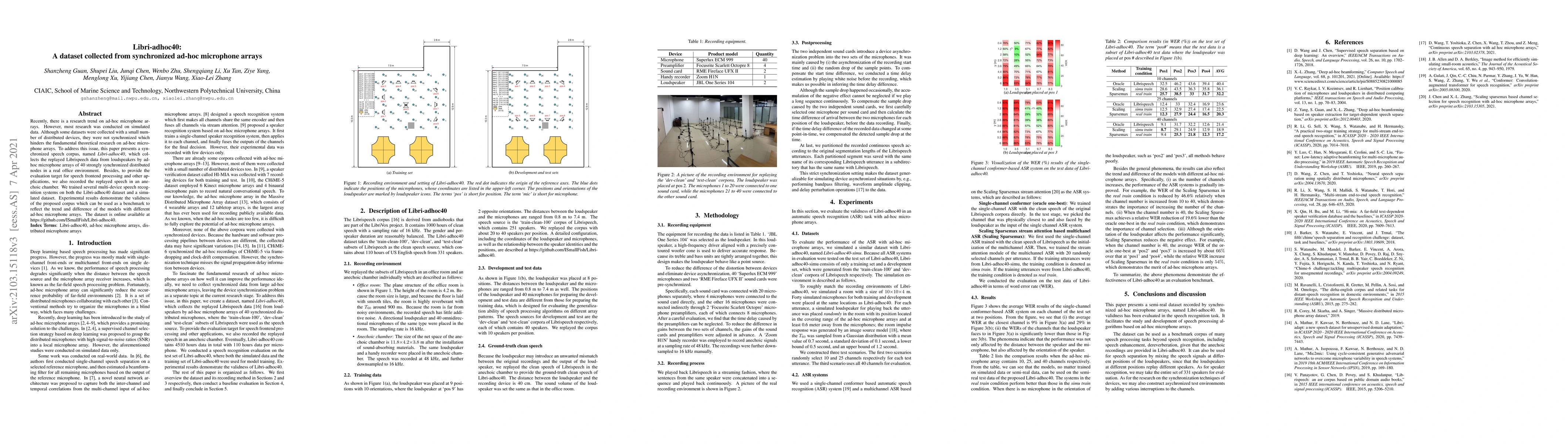 This paper introduces Libri-adhoc40, a synchronized speech corpus collected from 40 ad-hoc microphone arrays in a real office environment, addressing the lack of synchronized real-world data for ad-hoc microphone array research. The dataset is validated through multi-device speech recognition experiments, demonstrating its effectiveness as a benchmark for evaluating different ad-hoc microphone array models.